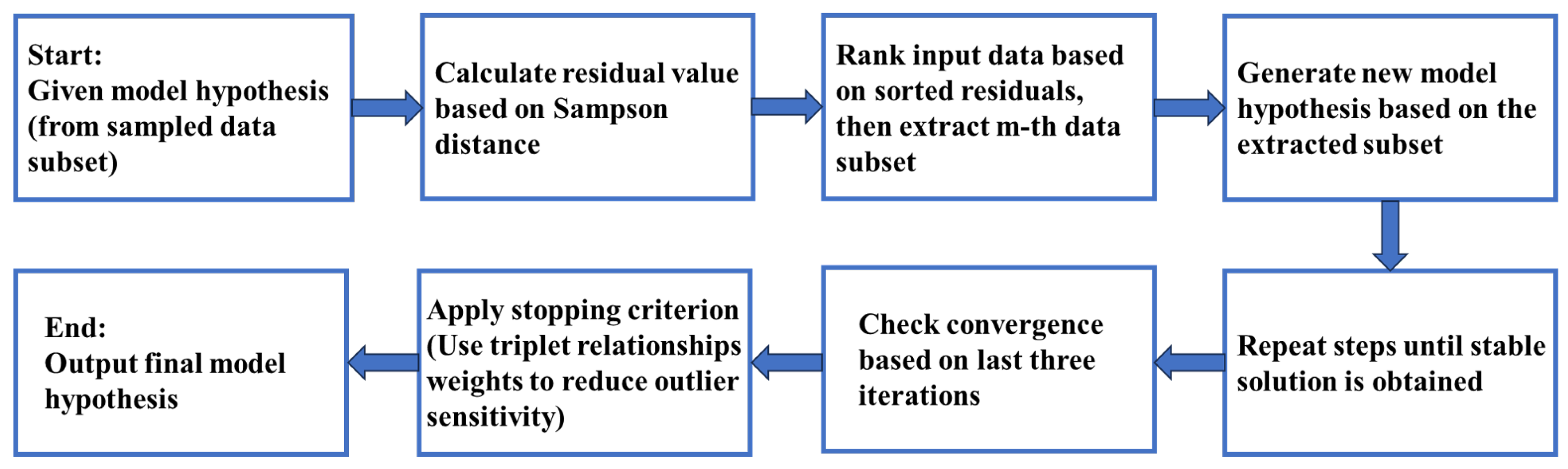 n-th data point according to the sorted residuals. These steps are repeated iteratively until convergence to a stable solution. Convergence of the data subset refinement process is assessed using the last three iterations, with MaxIter specifying the maximum number of iterations, and the weights computed from the sampled triplets serving as a stopping criterion to reduce sensitivity to outliers. Specifically, the stopping criterion