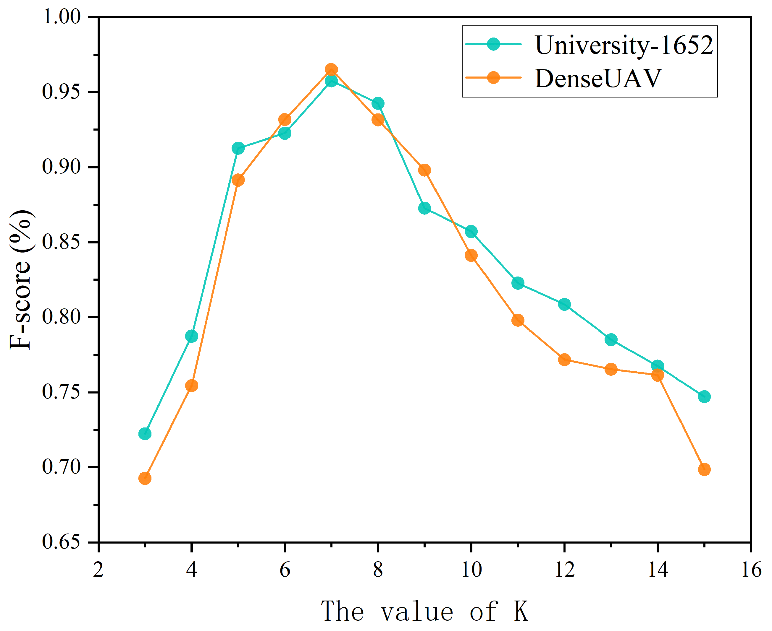 K, sensitivity experiments are performed on selected subsets of the University-1652 and DenseUAV datasets. Keeping all other parameters and procedures fixed, only