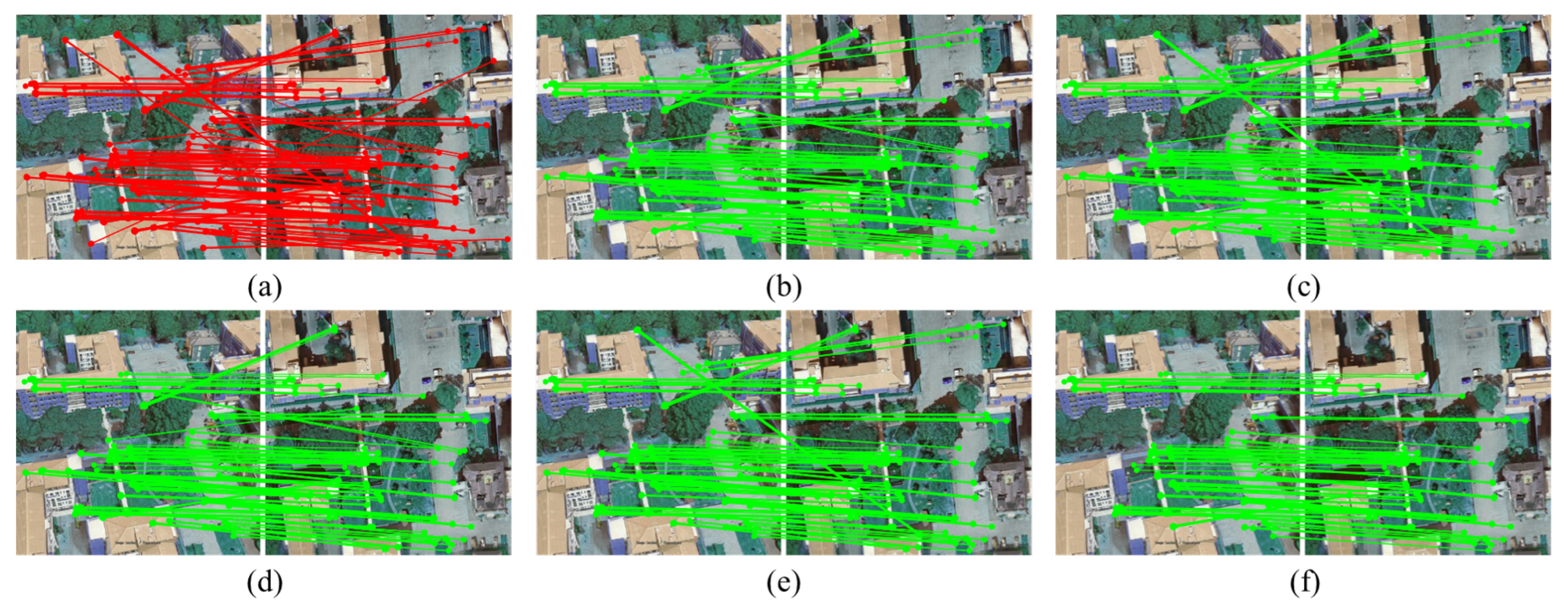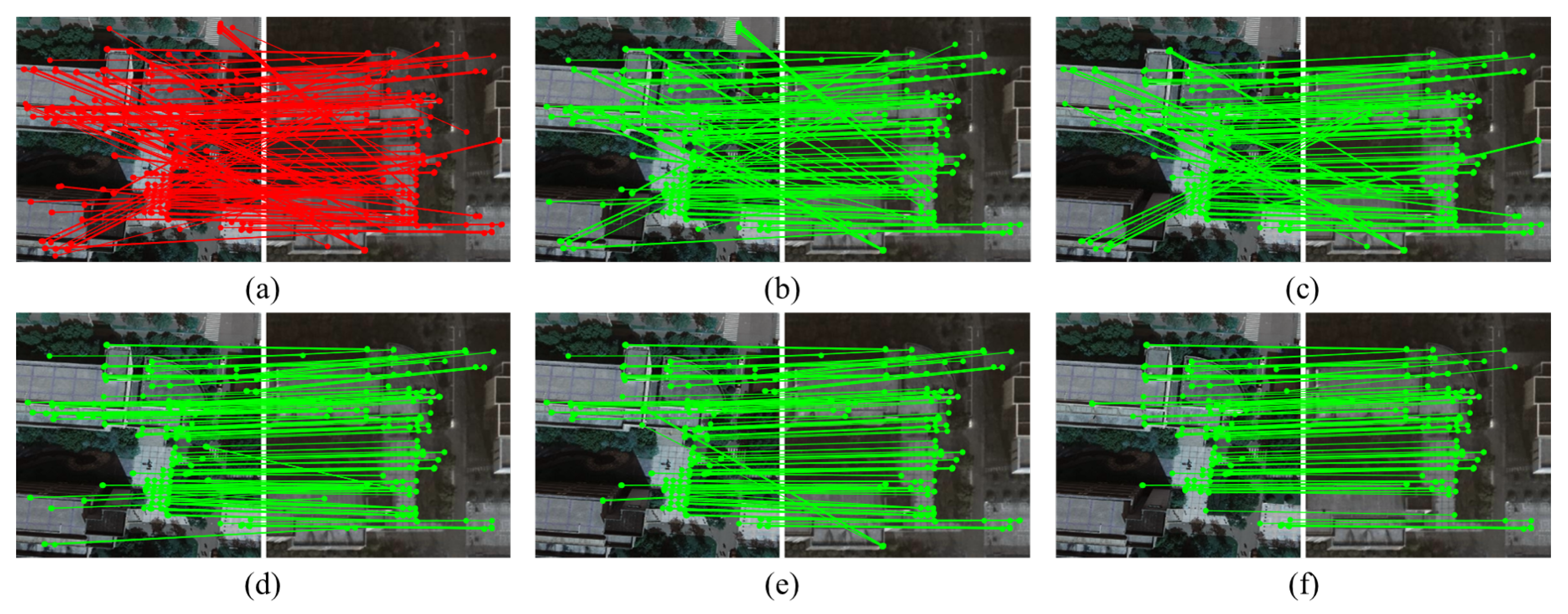 Table 1, incorporating the data subset refinement strategy increases the F-score by 24.72 percentage points. At the same time, the runtime increases by about 11.72%, with an extra 0.026 s incurred. For applications requiring real-time UAV visual localization, the additional processing time is acceptable, particularly given the significant enhancement in matching accuracy, which directly impacts localization reliability. Compared with the costs arising from localization failures due to incorrect matches or the need for more complex post-processing, this overhead is justified. In addition, the overall algorithm remains a lightweight geometric post-processing procedure, with runtime significantly lower than the forward inference time of deep learning-based end-to-end matching networks, demonstrating its applicability on resource-constrained platforms.