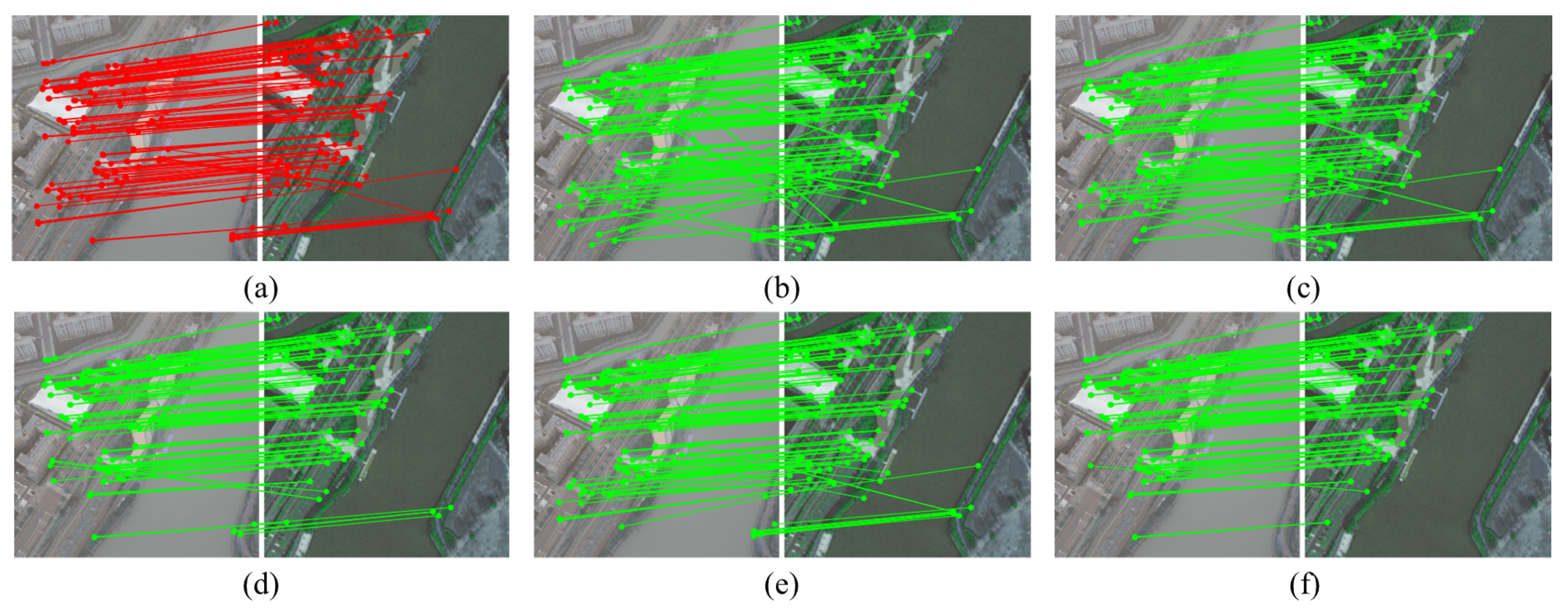 Table 2, following outlier removal, RANSAC attains a precision of 79.81%, a recall of 98.78%, and an F-score of 87.87%, indicating that RANSAC exhibits limited capability in suppressing noise under high outlier ratios, leading to significant deviations in estimated models. While LPM achieves a relatively high recall of 93.63%, its precision is only 83.87%, implying a tendency to erroneously discard certain true inliers in heterogeneous images with complex geometric structures. In contrast, the proposed algorithm maintains a recall of 88.97% while achieving a precision of 91.11% and an F-score of 89.66%, substantially outperforming the comparative algorithms, thereby achieving a more favorable balance between inlier retention and outlier removal.