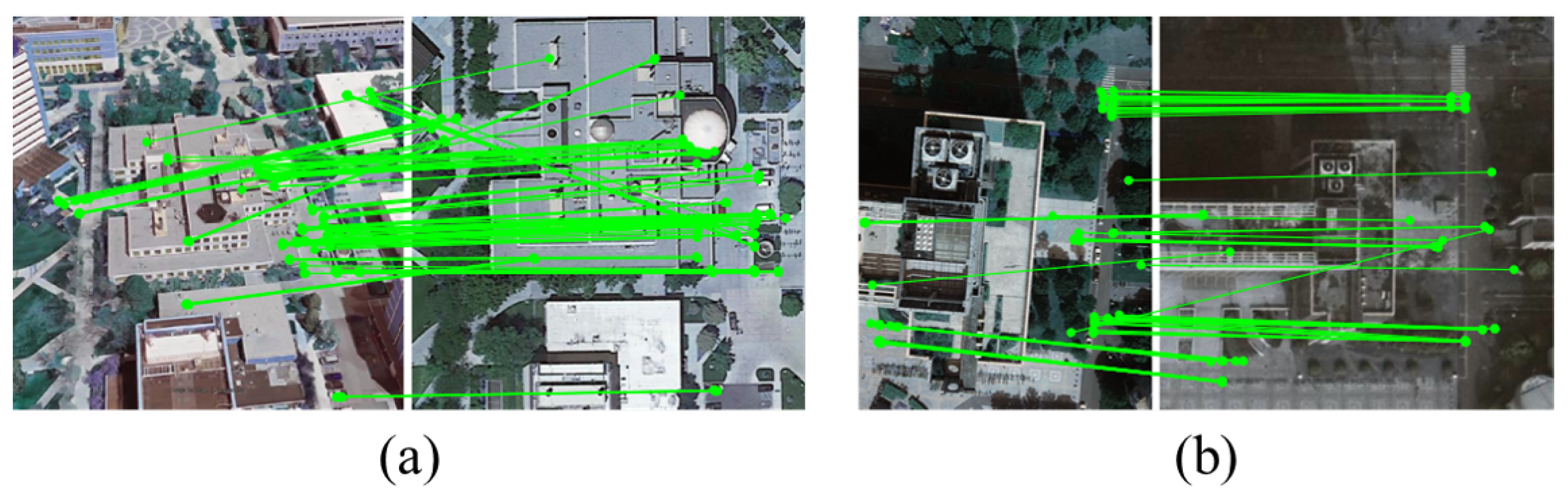 32]. These methods alleviate the dependency on pairwise annotated data to some extent and improve adaptability in cross-domain scenarios. However, in the specific mission of matching heterogeneous UAV remote sensing images, where imaging mechanisms differ significantly and viewpoints vary extremely, simple photometric constraints often fail, while learned local descriptors still face challenges in cross-domain generalization. Consequently, the robustness of the model fitting stage in the presence of a high proportion of outliers remains a prominent issue.