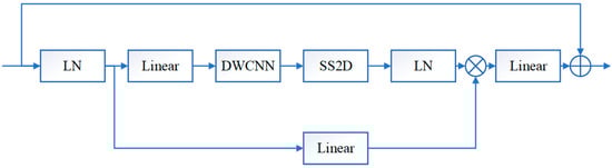 The CSM is further introduced in the visual Mamba model, and then the convolution operations are integrated into the VSS block. The structure of the visual state space module VSS is shown in Figure 2, where LN denotes layer normalization, Linear denotes a linear layer, DWCNN denotes depth convolution, and SS2D is 2D selective scanning. In the VSS block, the input features are first layer normalized to the linear embedding layer and then forked into two branches into different layers. One of the branches undergoes deep convolution [27] and SiLU [28] activation, enters the SS2D block, undergoes layer normalization again, merges with the other branch after SiLU activation, and finally enters the linear layer as well as residual concatenation to obtain the output. Unlike a typical vision transformer, the VSS module avoids positional embedding and chooses a streamlined structure without MLP phases, achieving a denser stack of blocks within the same depth budget.