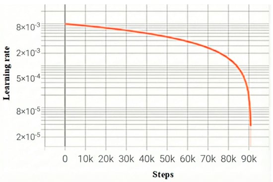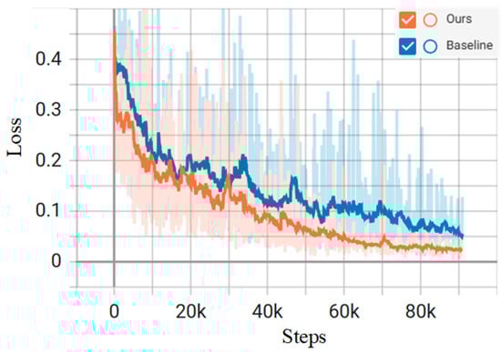 The learning rate decay curve, as well as the loss function change curve, during the training process are shown in Figure 5 and Figure 6, respectively, and the total loss, as well as the learning rate, is recorded once for each batch trained. The orange curve represents the proposed model, while the blue curve is the baseline model of Mamba. The horizontal coordinate step in Figure 5 and Figure 6 is the number of batches; the vertical coordinates, respectively, represent the learning rate and loss value of each batch of the model. As the model iterates, the model starts to converge when Step is 75k, i.e., about 250 training rounds.