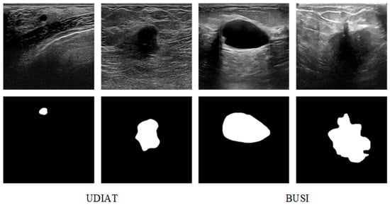 The datasets used in the proposed model are two breast ultrasound image segmentation datasets, BUSI [33] and UDIAT [13], as shown in Figure 7. The BUSI dataset contains 780 breast ultrasound images of female patients, which are classified into three categories: normal, benign tumors, and malignant tumors, and the datasets all contain segmentation mask maps for tumor cells. The UDIAT dataset contains 163 breast ultrasound images with detailed annotations, of which 53 are malignant tumors, and the remaining 110 are benign tumors.
