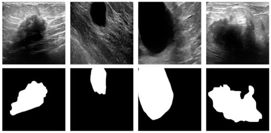 The mixed BUSI and UDIAT dataset is firstly divided into training and test sets in the ratio of 8:2. In order to expand the dataset samples to cope with more complex environments and to improve the robustness of the model, data enhancement was performed on the training set and test set using flipping, random cropping, and other methods, respectively, to obtain the new experimental dataset, as shown in Figure 8. The new experimental dataset contains 3028 ultrasound images as well as 3028 segmentation mask images. This not only solves the problem of insufficient training data but also simulates the complexity in many breast ultrasound images, improves the segmentation performance of the network, and improves the generalization ability of the model.