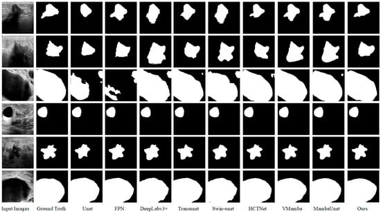 Figure 9 shows the visualization of the segmentation results of eight different medical image segmentation models compared with the proposed model on the experimental dataset. Six images from the experimental dataset consisting of BUSI and UDIAT are selected, which include benign and malignant tumor images. The first column is the input breast ultrasound image, the second column is the real mask label, and the third column to the tenth column are the segmentation results of Unet, FPN, Deeplabv3+, Transunet, Swin-unet, HCTNet, VMamba, and MambaUnet models in turn. The last column shows the segmentation results of our proposed model.