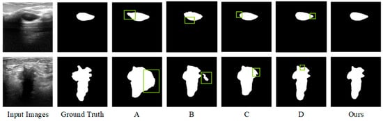 Figure 10 demonstrates a comparison of the visualization results of some ablation experiments on the dataset, where the green boxes mark the inaccurate regions. The baseline network A can only roughly localize the lesion region, and the misclassification range is large. While the lesion region localization is more accurate after adding the hybrid attention enhancement mechanism, the boundary contour of the segmentation target is not accurately grasped. After further adding the cross-fusion module, the model can not only accurately localize the lesion region but also control the details of the boundary more accurately, and the segmentation effect is optimized.