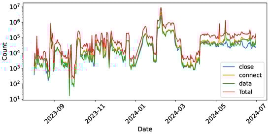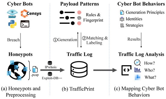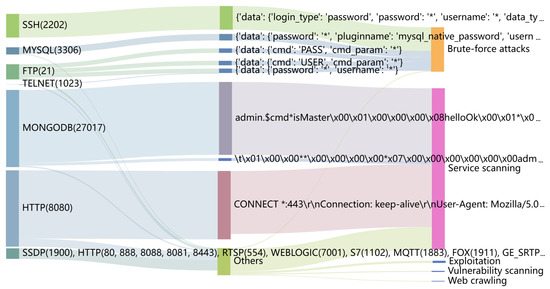 Figure 11 visualizes the flow of cyber bot traffic, with the ports displayed on the left. The traffic corresponding to the payload patterns received by the honeypot’s forged services is then categorized according to specific cyber bot behaviors, where the width of the arrows indicates the contribution from each category. Analyzing different cyber bot behaviors provides insights into their strategic preferences, such as selecting specific services or adapting payload content to evade detection.