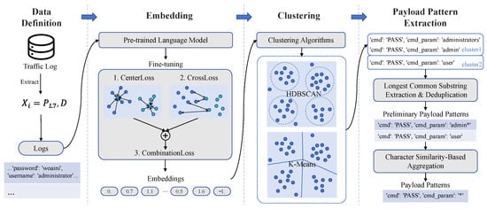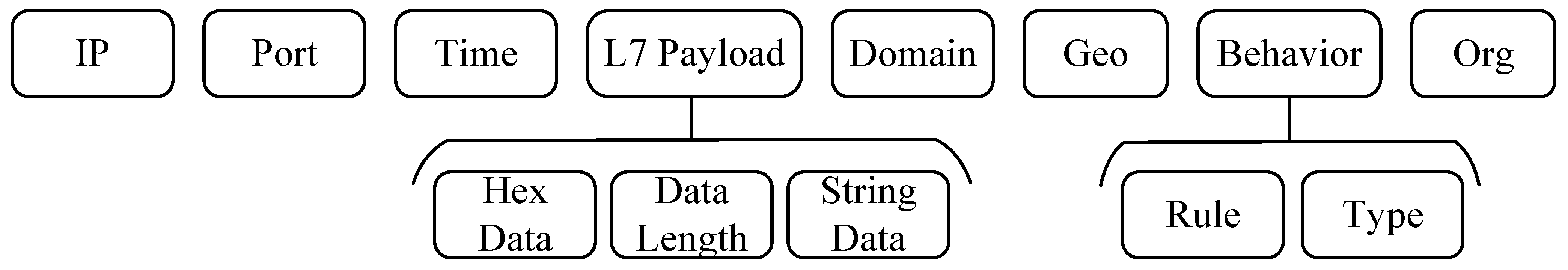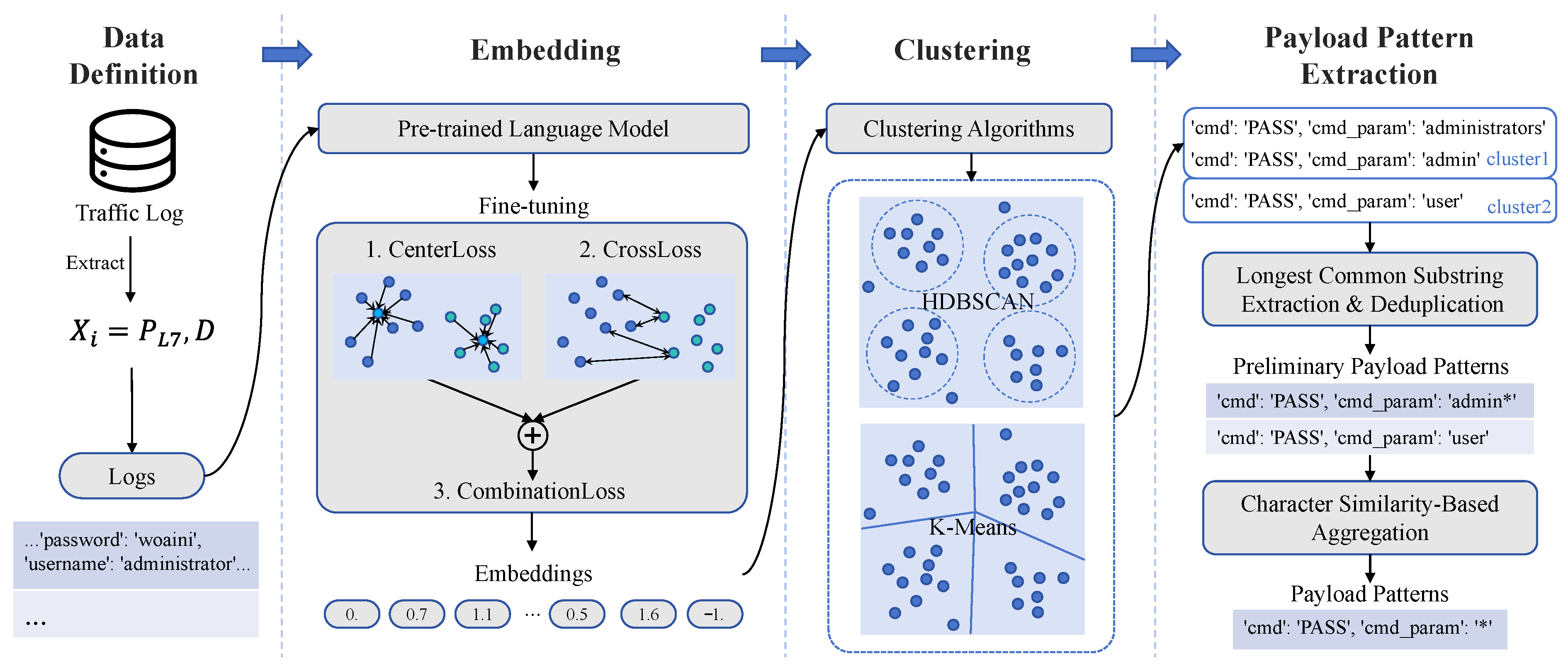 Table 1 defines and distinguishes the behaviors associated with these payload patterns. Among the labeled payloads, which are obtained using both public rules and TrafficPrint, the distribution across behavior categories is as follows: service scanning (78.14%), Web crawlers (0.39%), brute-force attacks (19.98%), vulnerability scanning (0.62%), and exploitation (0.86%).