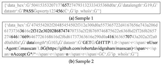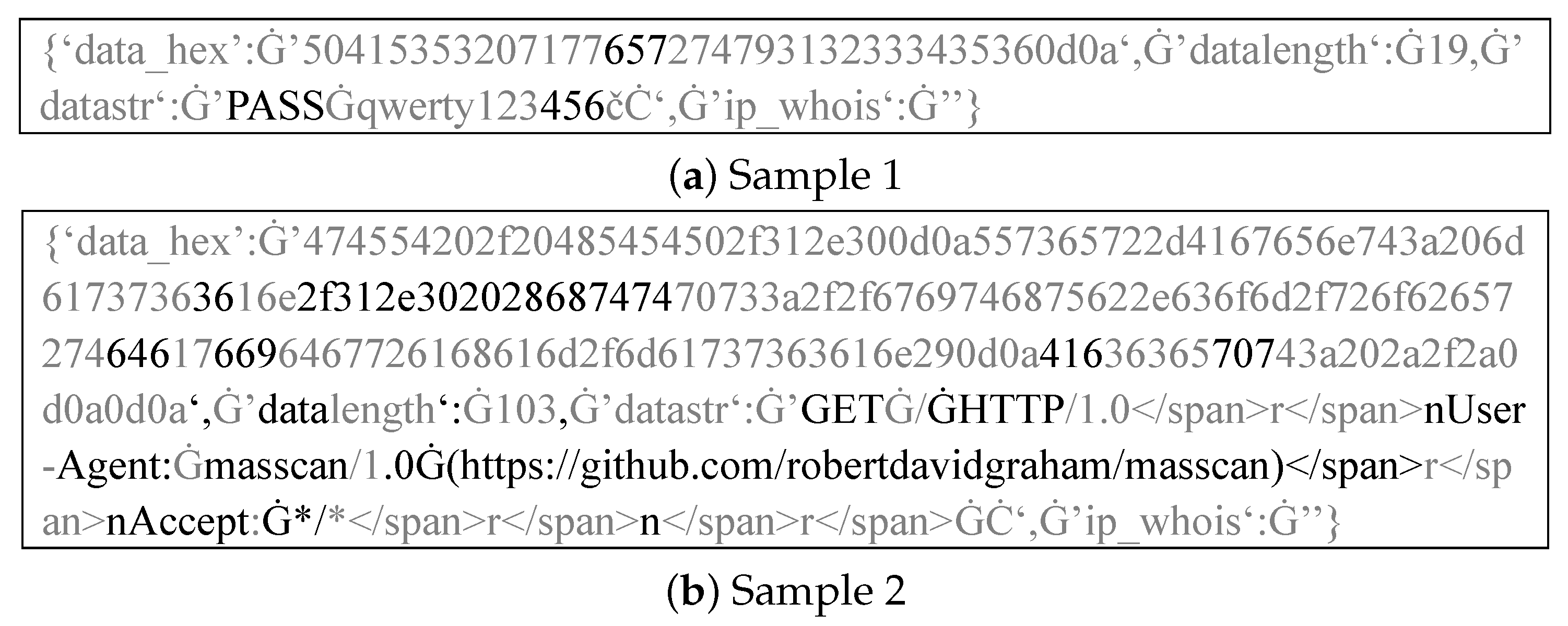 Fully customized payloads. These payloads, with the highest level of customization, are not based on any publicly recognized protocols and are specifically crafted for cyber bot activities. Through our payload pattern analysis, we observe that these payloads are frequently employed in generic probing activities rather than being tailored to interact with specific services or ports. The following are two representative examples of fully customized payloads: