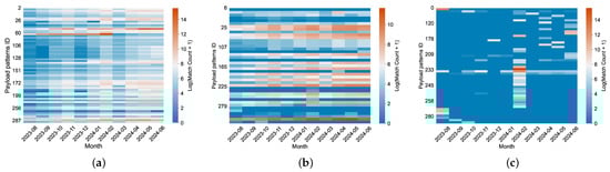 Temporal Modes. Although the generation principles of behaviors can be explained through payload structure, important information such as the timing and frequency of occurrences also plays a key role. We discover three time-dependent modes in 54% of the payload patterns, illustrated through separate heatmaps. As shown in