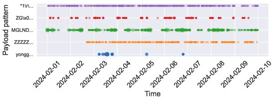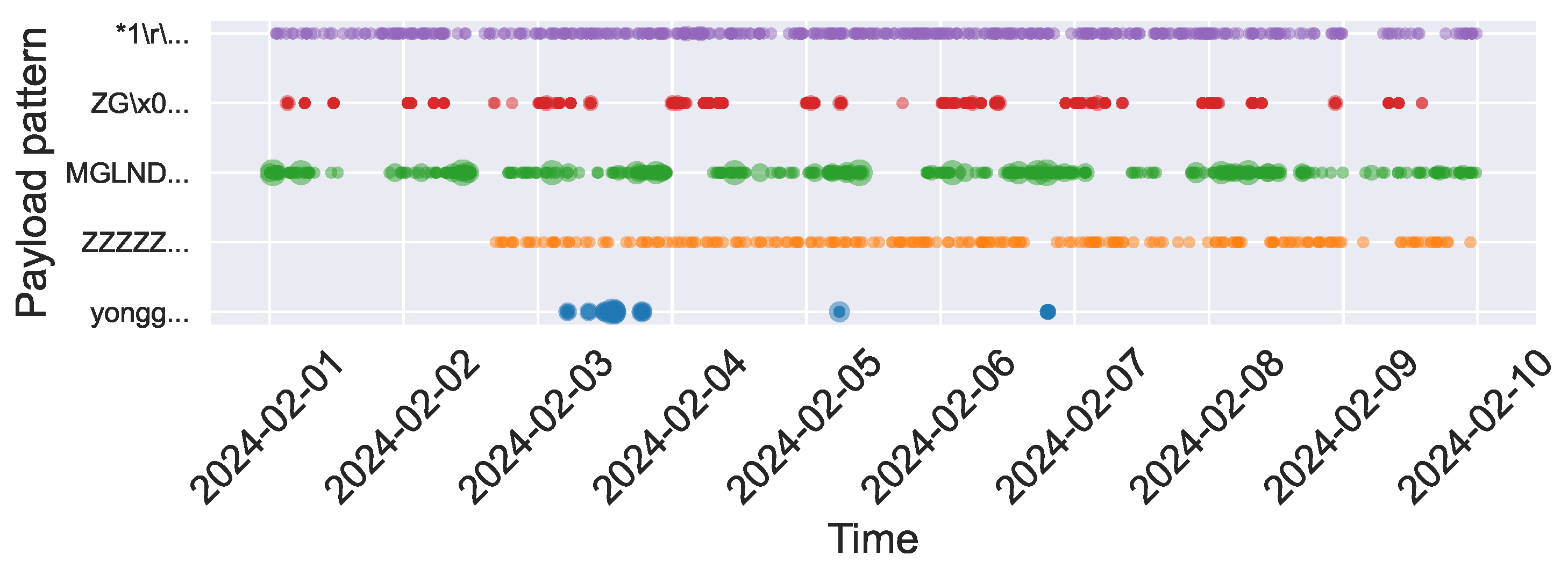 Figure 10, these payload patterns, which implicitly reveal cyber bot identities, exhibit clear periodicity and distinct behavioral patterns. These identity-specific behavioral signatures enable attribution beyond IP-based tracking: when similar payload sequences appear from new sources, defenders can cluster them as likely coordinated infrastructure based on shared configuration fingerprints [