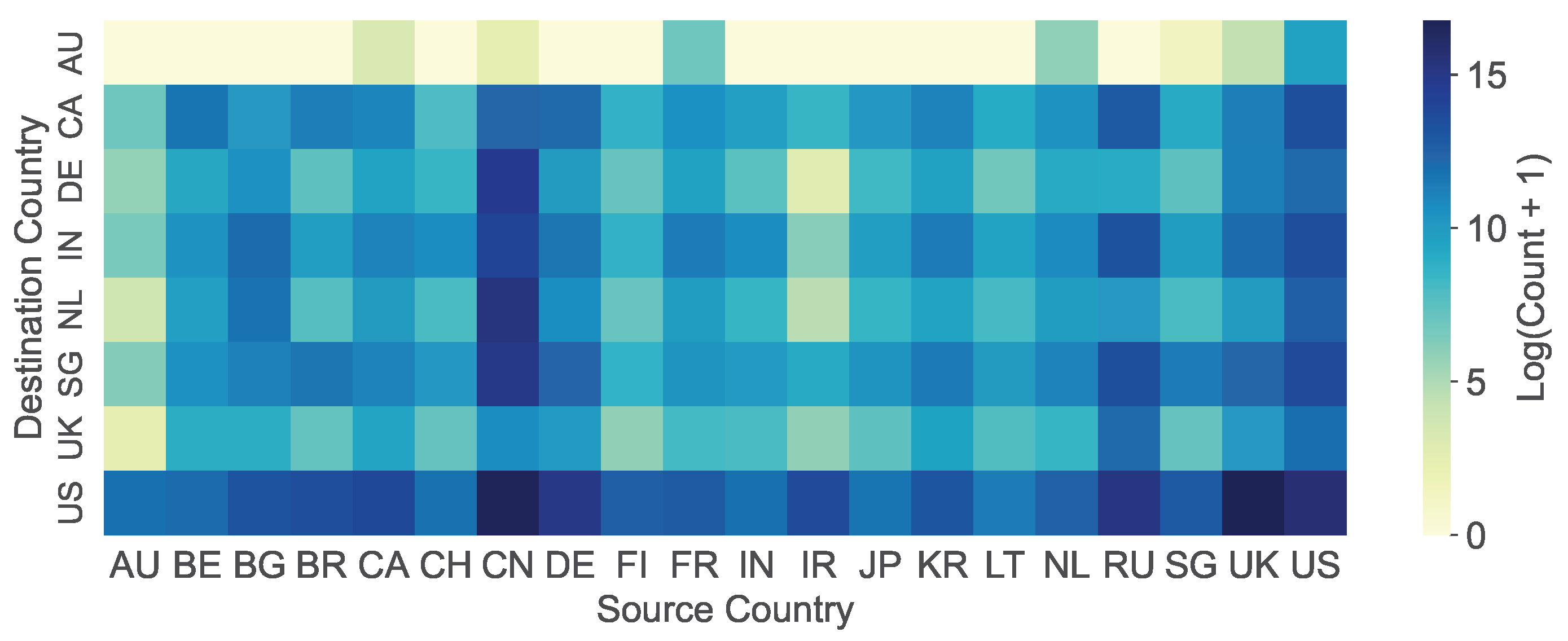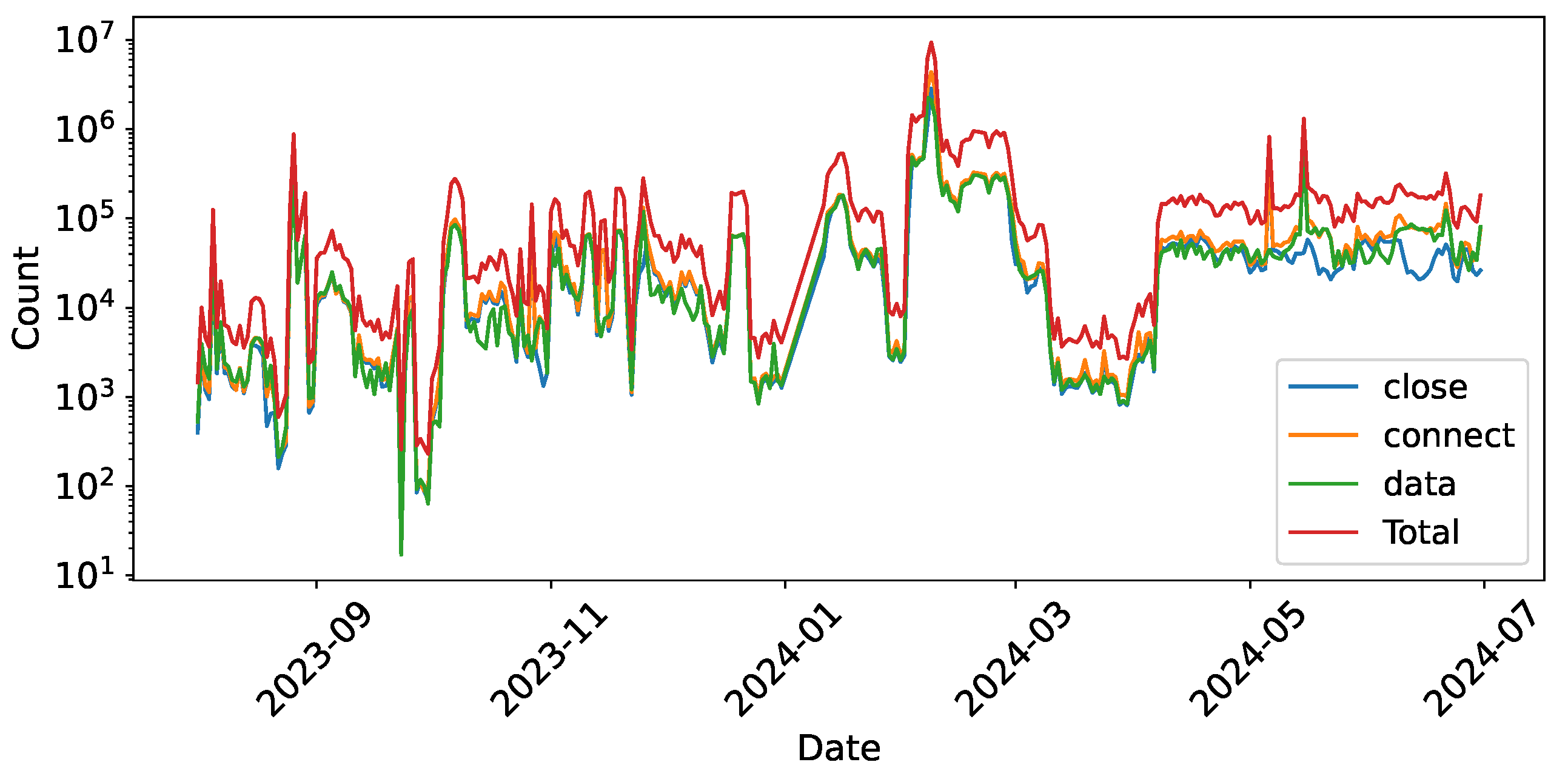 63] or probe servers of popular websites to uncover hidden services or match server fingerprints. Less popular domains can serve as indicators of the organizations controlling cyber bots, since only specific entities are likely to access these obscure destinations. Additionally, in some HTTP-related CONNECT payload patterns, we find Base64-encoded identifiers that embed the request’s current timestamp. This suggests that these requests are likely generated by cyber bots that log or track scanning activity, possibly for replay or monitoring purposes [