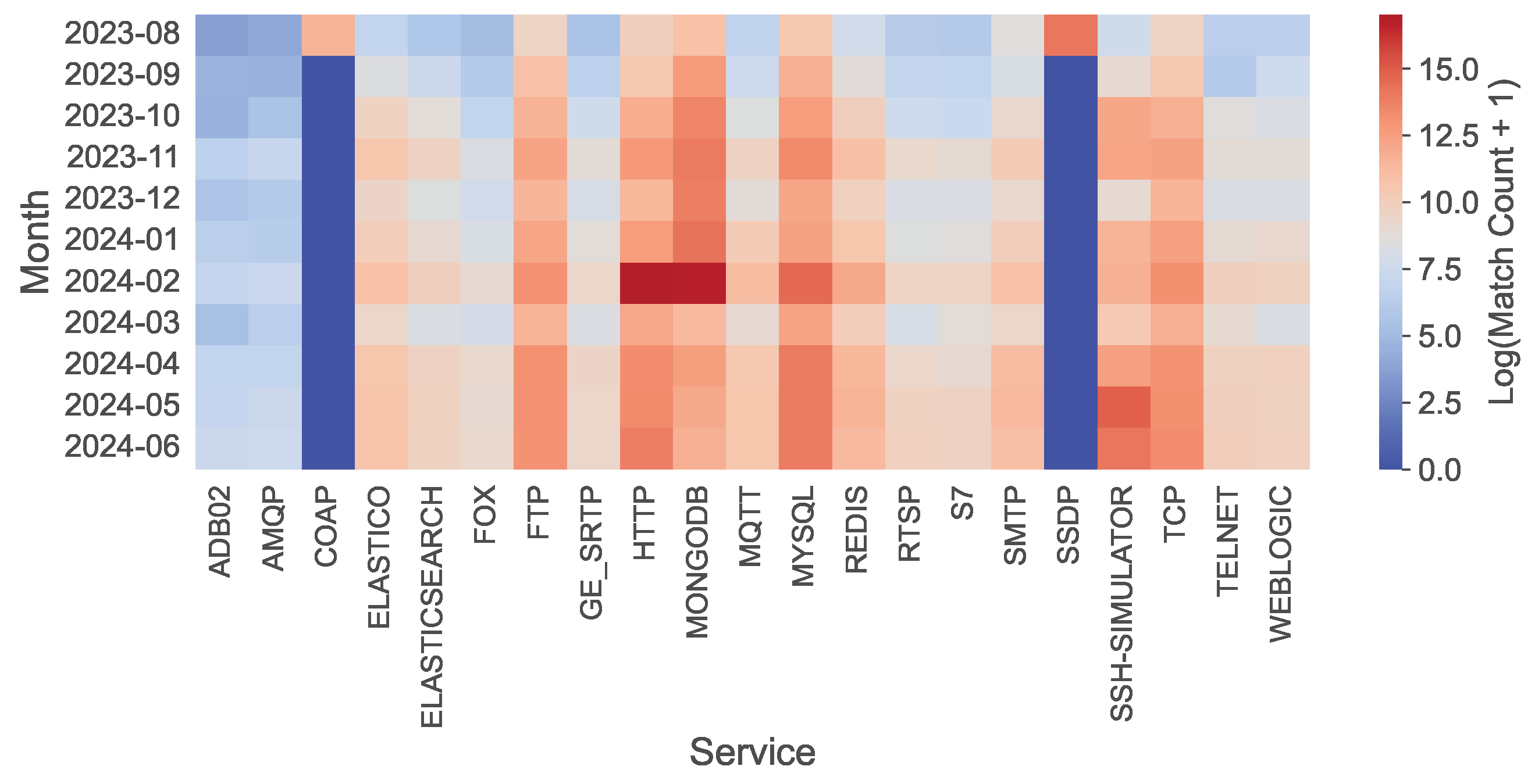 Service Scanning. The deployment of a multi-service honeypot significantly broadens the scope of cyber bot activities, leading to a wider variety of behaviors. Consequently, service scanning represents a substantial portion of the observed traffic.