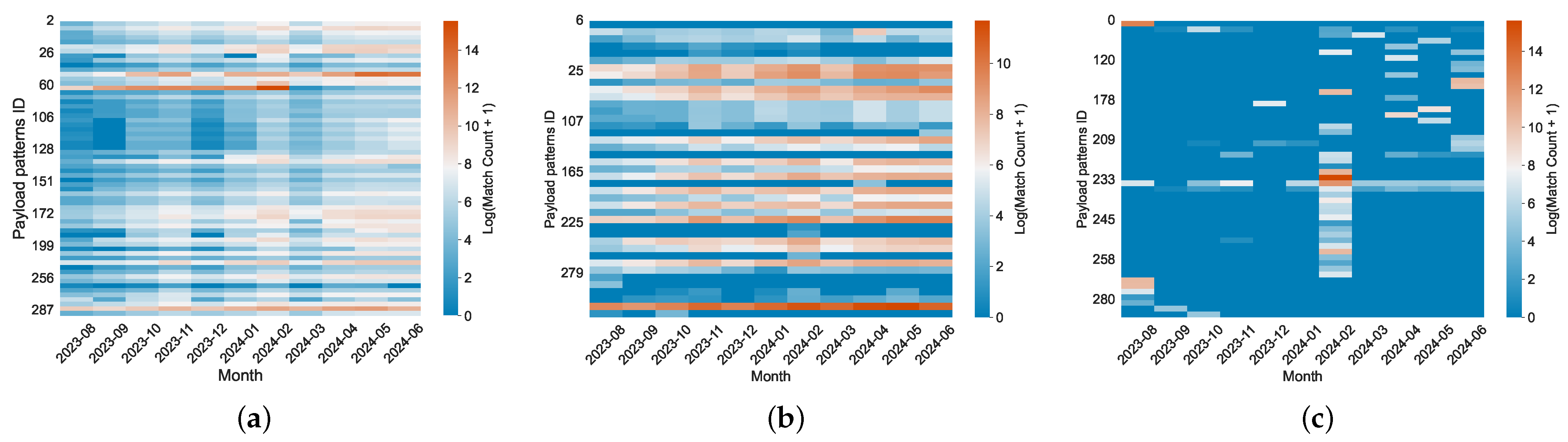 Figure 9a, we find that payload patterns (22%) show a matching trend consistent with the overall traffic volume for months, contributing to the traffic surge. Additionally, as shown in