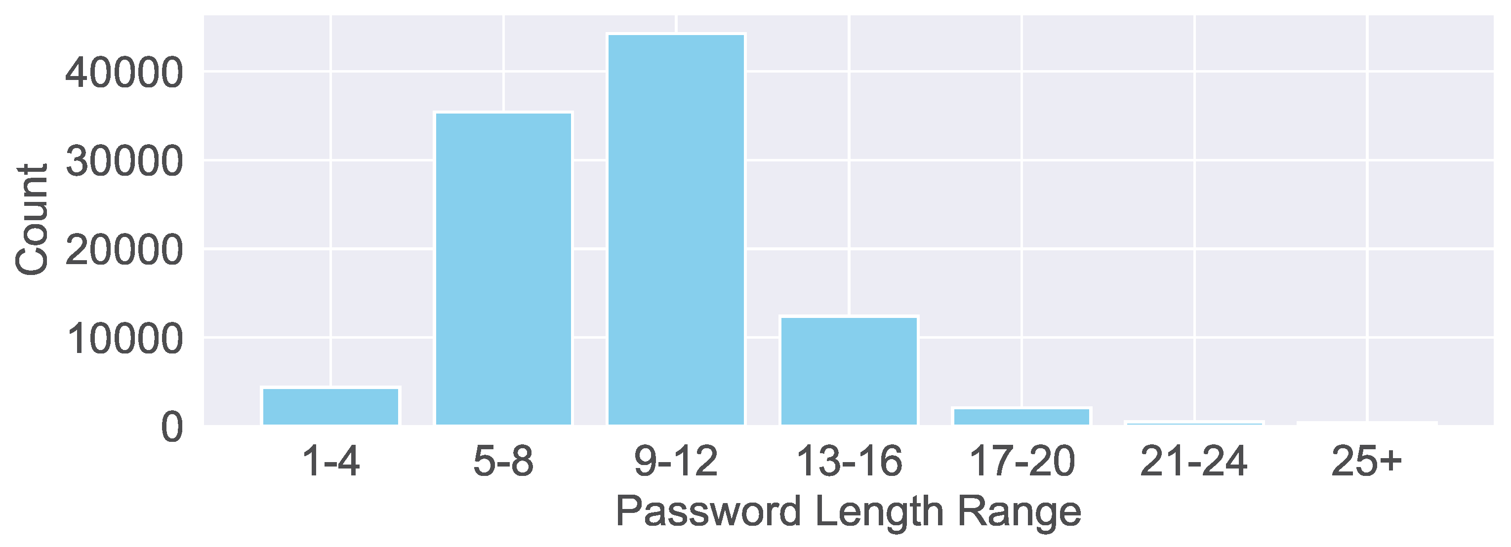 Figure 12 illustrates the distribution of password lengths used by cyber bots, with the majority falling between 9 and 12 characters. In contrast, credentials longer than 20 characters are generally considered more secure. In terms of password complexity, we observe the following distribution: low complexity (41.86%), consisting solely of letters; medium complexity (50.62%), incorporating both letters and numbers; and high complexity (7.53%), combining uppercase and lowercase letters, numbers, and special characters.