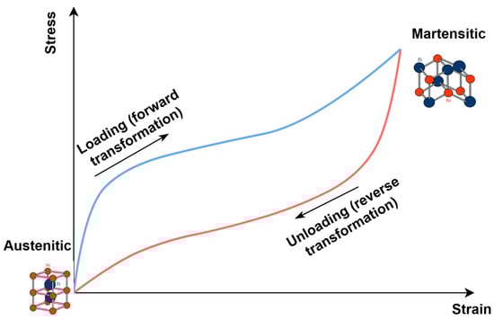 Owing to their ability to undergo reversible phase transformations, SMAs can recover their original shape in response to changes in temperature or applied mechanical loading. This unique mechanism is governed by microstructural rearrangements and the interplay between the material’s mechanical and functional properties. As a result of the reversible transformations occurring during the superelastic cycle, a hysteresis loop appears in the stress–strain space, the area of which corresponds to the energy dissipated by the material during transitions between austenite and martensite (Figure 2).