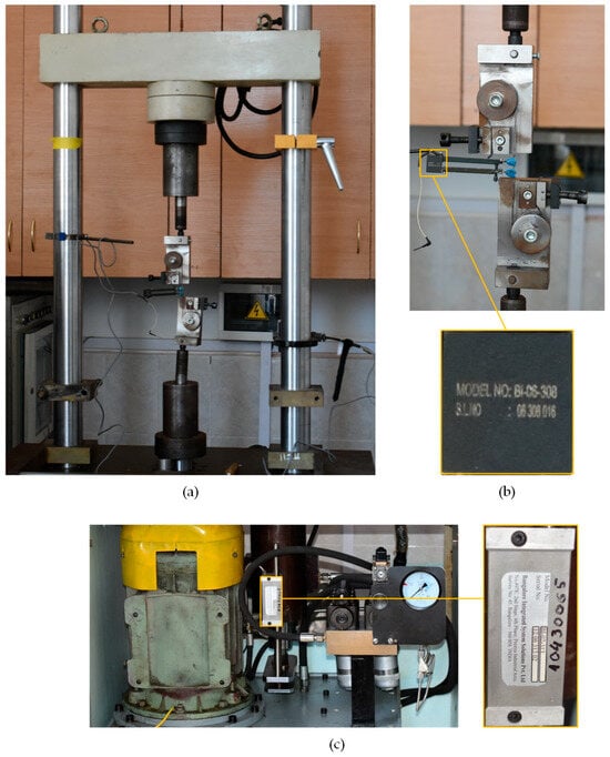 The machine for the experiment: (a) general view of the STM-100; (b) test sample fixed in the grippers and Bi-06-308 sensor; (c) Bi-02-313 sensor.