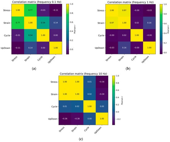Pearson correlation coefficient matrix for cyclic loading with a frequency of 0.1 Hz (a), 1 Hz (b), and 10 Hz (c).