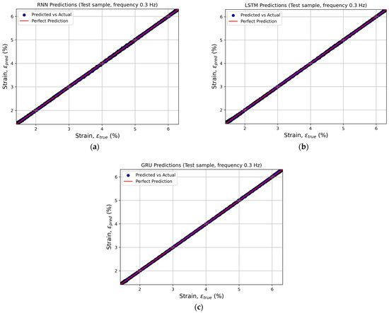 Comparison of the actual and predicted strain values at a loading frequency of 0.3 Hz for recurrent neural networks: (a) SimpleRNN, (b) LSTM, and (c) GRU.