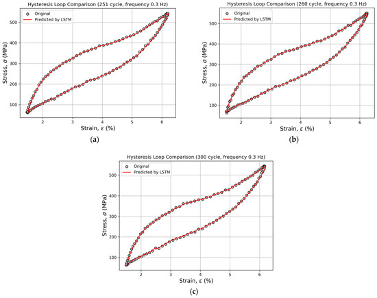 Comparison of experimental and predicted hysteresis loops for cycles 251 (a), 260 (b), and 300 (c) at a loading frequency of 0.3 Hz, obtained using the LSTM model.