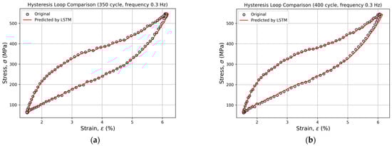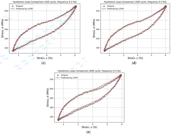 Figure 7 and Figure 8 present an example of the comparison between the experimental and predicted hysteresis loops generated by the LSTM model for cycles 251, 260, 300, 350, 400, 450, 500, and 600 at a loading frequency of 0.3 Hz. Within the range of cycles 251–300, the predicted and experimental curves almost perfectly overlap, demonstrating the model’s high accuracy in reproducing the material’s hysteresis behavior (Figure 7).