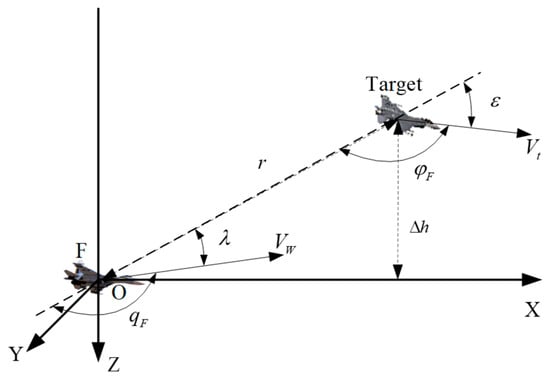 The primary task of the UAV’s situation awareness system is to determine its tactical advantage relative to a Target (which could be another UAV or a ground object) based on parameters like position, attitude, and motion state. The geometric relationship between the UAV and the Target is shown in Figure 1. In the UAV axis OXYZ, the center of gravity of the UAV is taken as the origin , X-axis is in accordance with the longitudinal axis of the UAV, pointing to the head direction, Y-axis perpendiculars to the symmetry of the UAV, pointing to the right side; Z-axis lies in the symmetry of the UAV and perpendicular to the longitudinal axis, pointing downwards. Azimuth angle refers to the angle between Target’s line of sight and speed direction of our UAV, Target entry angle refers to the angle between extension line of Target’s line of sight and speed direction of Target UAV, refers to the angle between velocity vectors of two UAVs.