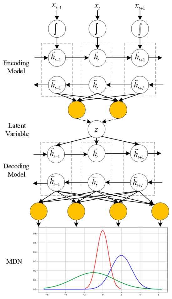 The key difference from the standard VAE objective in Equation (4) is that the reconstruction term is now computed using the probability density of the Gaussian mixture output by the MDN. This modification is the mathematical embodiment of our model’s enhanced capability. It allows the objective function to reward the model for accurately capturing multi-modal data distributions, directly addressing a core limitation of conventional VAEs that assume a simple, unimodal output.