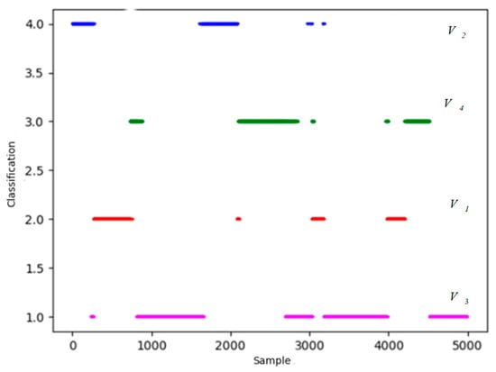 The yellow shaded area highlights a critical discrepancy. Within this period, the dominance function clearly indicates that our UAV holds a significant advantage (the red line is consistently above the blue line). However, the clustering algorithm misclassifies this entire segment as a neutral situation (V3), failing to capture the shift in tactical advantage. Such errors are common in purely data-driven approaches, especially during transitional moments of an engagement. This discrepancy underscores the importance of the final refinement step, where the dominance function and expert knowledge are used to correct these misclassifications, as shown in the final results in Figure 15 and Figure 16, leading to a more accurate and operationally consistent situation assessment.