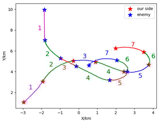 Figure 17 and Figure 18 show the classification results of two-dimensional and three-dimensional situation. Figure 19 displays the situation values and the corresponding classification results. In Figure 17 and Figure 18, red represents our UAV and blue represents the Target. The flight path is presented with red, blue, magenta and green in accordance with the situation V1~V4 respectively. The confrontation situation is divided into seven parts by the model. Part 1 corresponds to situation V3: at entry stage, the distance between both agents is large, far away from engage conditions; Part 2 corresponds to situation V4: both sides begin to maneuver and enter the confrontation area, threatening each other; Part 3 corresponds to situation V2: the Target emerges at the rear flank of our UAV, leaving us at a disadvantage. Part 4 corresponds to situation V4: our UAV has the advantage of altitude, while the Target occupy a slight advantage of angle, which contributes to the balance situation between both agents. Part 5 corresponds to situation V2: Target maneuvers heavily, expanding the advantage of the angle and narrowing the altitude gap. Therefore, our UAV is at a disadvantage. Part 6 corresponds to situation V4: both sides can maneuver to engage each other. Part 7 corresponds to situation V1: our UAV has the advantages of angle and altitude after Part 5 and Part 6, getting the opportunity to engage in the rear. Our UAV is at an advantage. The law of situation changes in Figure 19 is basically the same as the result of classification in Figure 17 and Figure 18. Therefore, the validity of the proposed model is verified in the actual confrontation process.