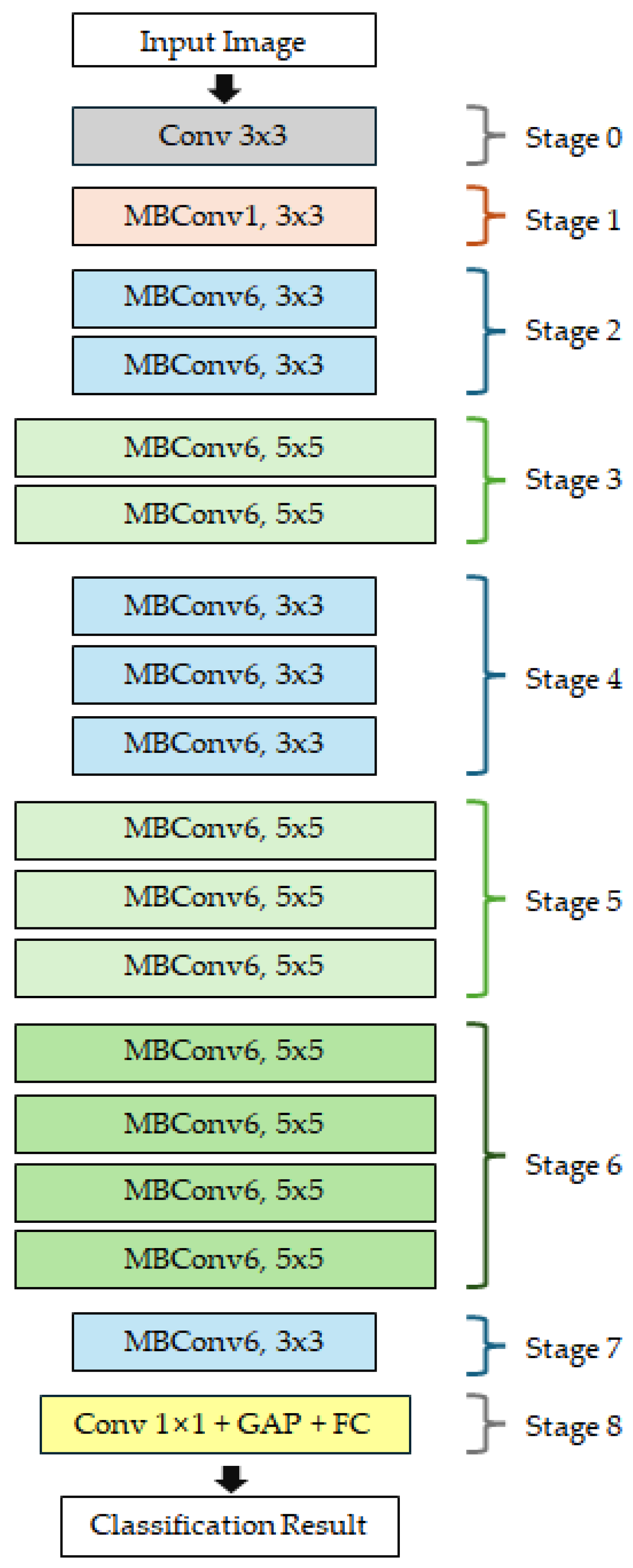 Figure 1 illustrates the overall architecture of EfficientNet-B0 model, the baseline model of the EfficientNet series. The input image passes through a network composed of a total of 9 stages (Stage 0–8). Stage 0 consists of a 3 × 3 convolution layer that extracts low-level features from the input image. Stages 1–7 consist of MBConv blocks with varying kernel sizes (3 × 3 or 5 × 5) and expansion ratios (1 or 6), enabling the model to progressively capture multi-scale features. Stage 8 comprises a 1 × 1 convolution layer, global average pooling (GAP), and a fully connected (FC) layer, which integrates the extracted high-level features and outputs the final classification result. The EfficientNet series expands from B0 to B7 by adjusting the compound scaling coefficient based on B0 as the basic architecture. In this study, EfficientNet-B0, B1, and B2 models were selected as baseline models considering the small-scale dataset and real-time inference environment.
