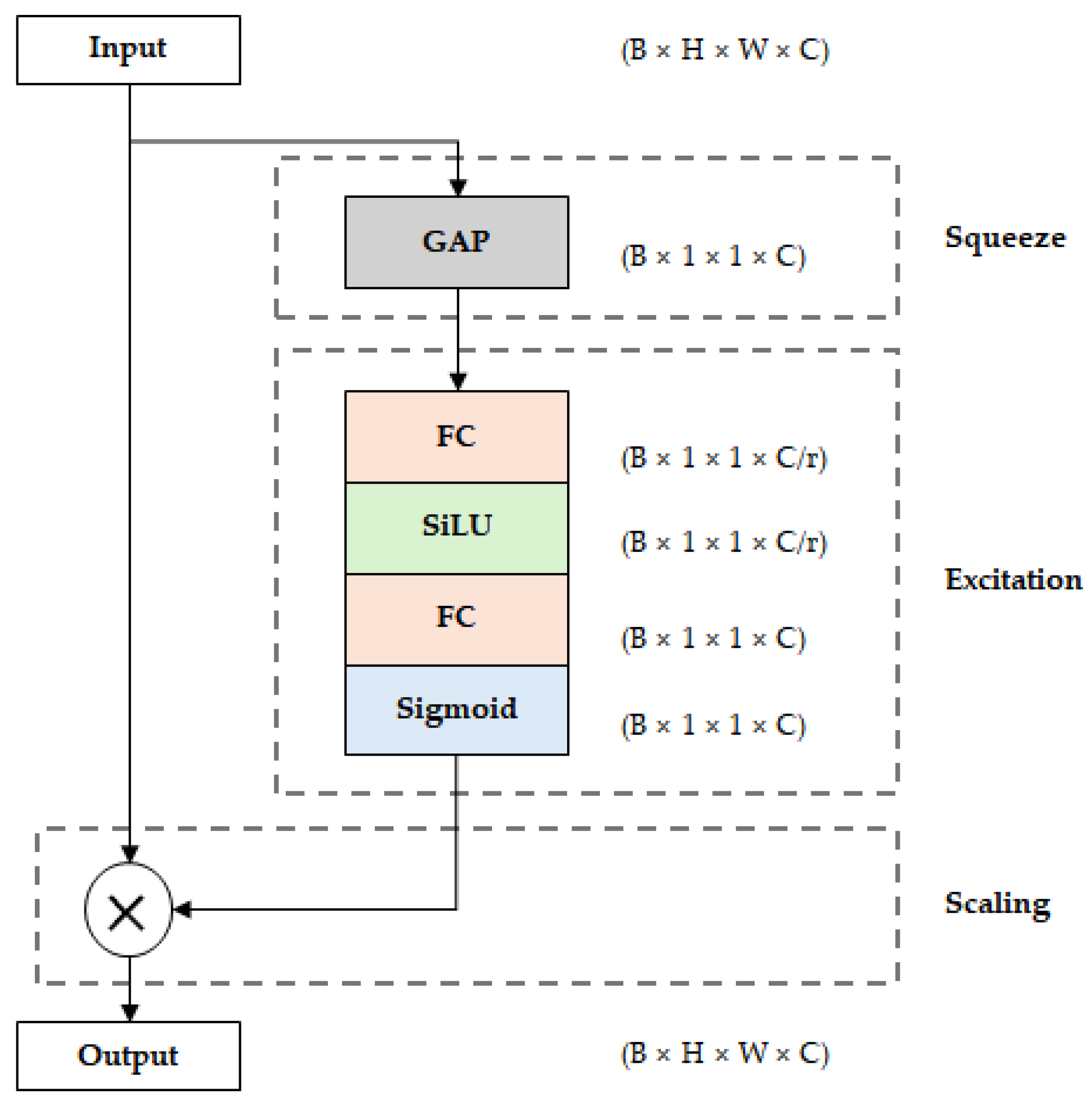 The Squeeze-and-Excitation (SE) block [18] is a module that recalibrates feature maps by learning inter-channel dependencies. The structure of the SE block is shown in Figure 2. First, in the squeeze stage, global average pooling (GAP) is performed on the input feature map to extract channel-wise statistics. Then, in the excitation stage, channel-wise weights are calculated through two fully connected (FC) layers and an activation function. In the first FC layer, the channel reduction ratio (r) is applied to reduce the number of parameters, and in the second FC layer, it is expanded back to the original number of channels. At this time, SiLU is used as the activation function of the first FC layer, and the sigmoid function is used in the second layer to normalize the weight values between 0 and 1. Finally, in the scaling stage, these calculated channel-wise weights are multiplied by the original feature map to enhance the representation of important channels and suppress the contribution of unnecessary channels. In EfficientNet, the SE block is incorporated within each MBConv block and operates in combination with convolution operations. While the SE block improves feature representation, it also increases the number of parameters and computational cost due to the additional FC layers and operations.