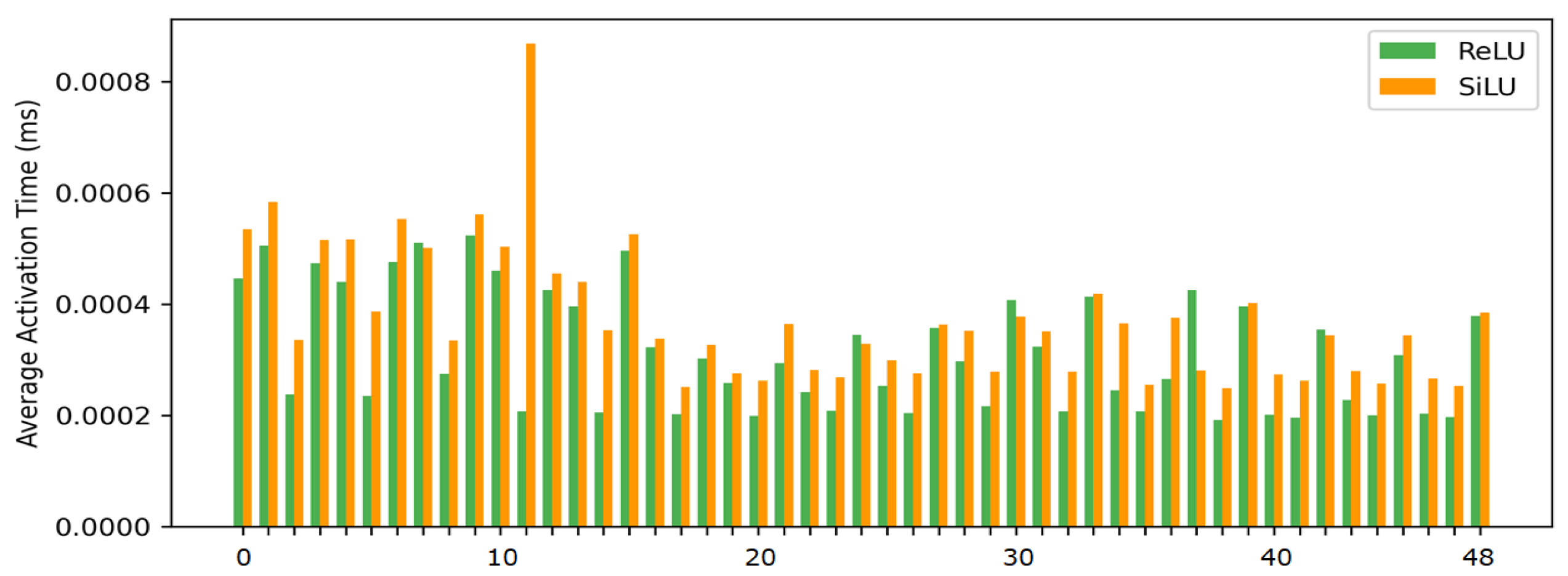 Figure 4. Comparison of computational speed between ReLU and SiLU for each of the 49 activation operations in EfficientNet-B0 on the CPU.