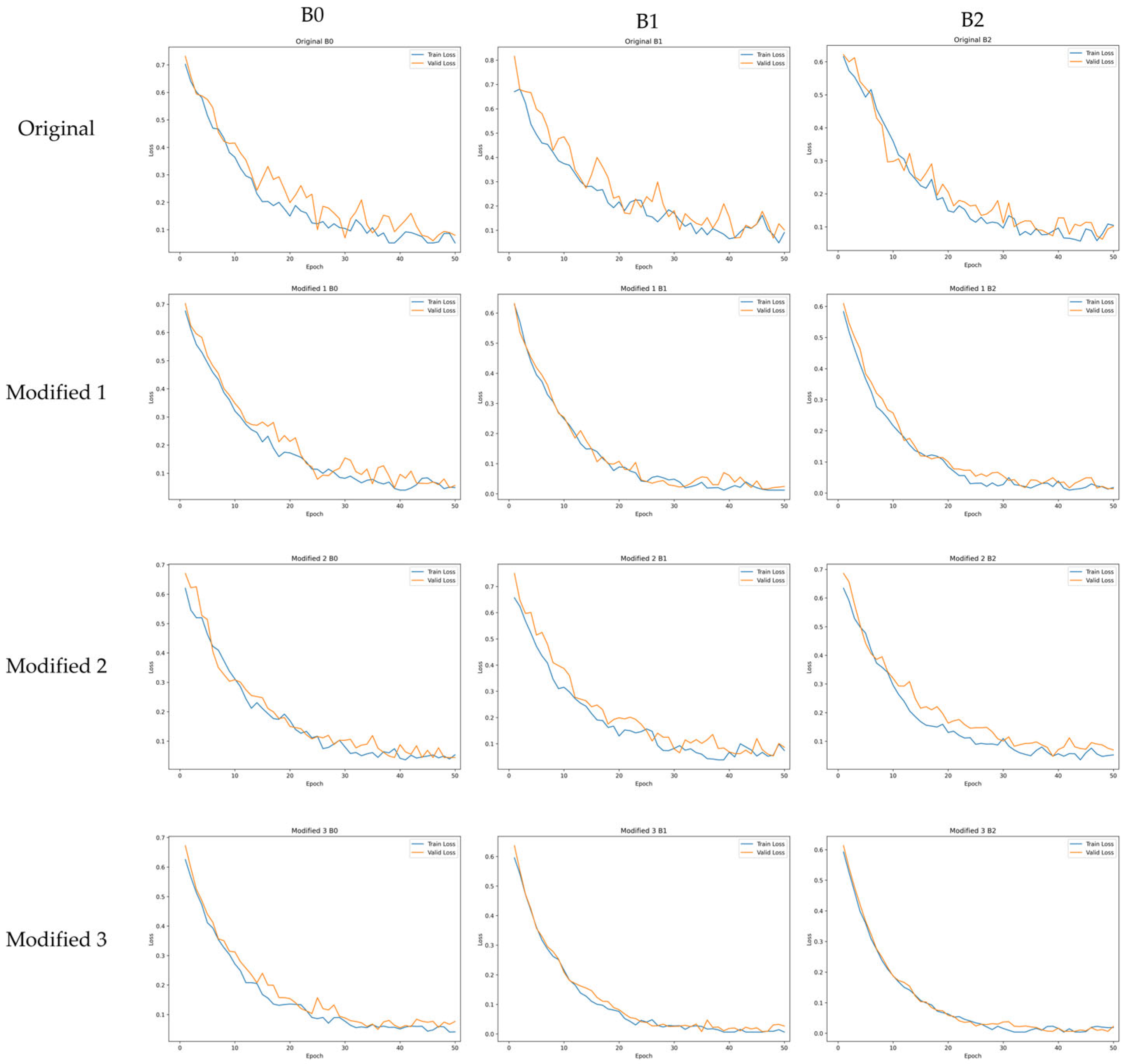 Model performance metrics were calculated based on the confusion matrix using the test set. Figure 8 presents the confusion matrices visualizing each model’s prediction results, showing the classification outcomes between the actual and predicted labels. Model classification performance was compared based on the accuracy metric, and the results are summarized in Table 4. Overall, the proposed Modified models consistently outperformed the original models. The Modified 1 model, which only replaced the activation function, achieved accuracy of 0.86, 0.98, and 0.98 for B0, B1, and B2, respectively, demonstrating overall superior performance compared to the original models. The Modified 2 model simplified the architecture by removing SE blocks and achieved accuracy of 0.89, 0.88, and 0.90 for B0, B1, and B2, respectively, maintaining higher performance than the original models. Finally, the Modified 3 model, which applied both activation function replacement and SE block removal, achieved accuracy of 0.90, 0.99, and 1.00 for B0, B1, and B2, respectively, showing the best performance among all models. These results indicate that activation function replacement and SE block removal not only reduced computation but also contributed to improving generalization performance by preventing unnecessary feature learning.