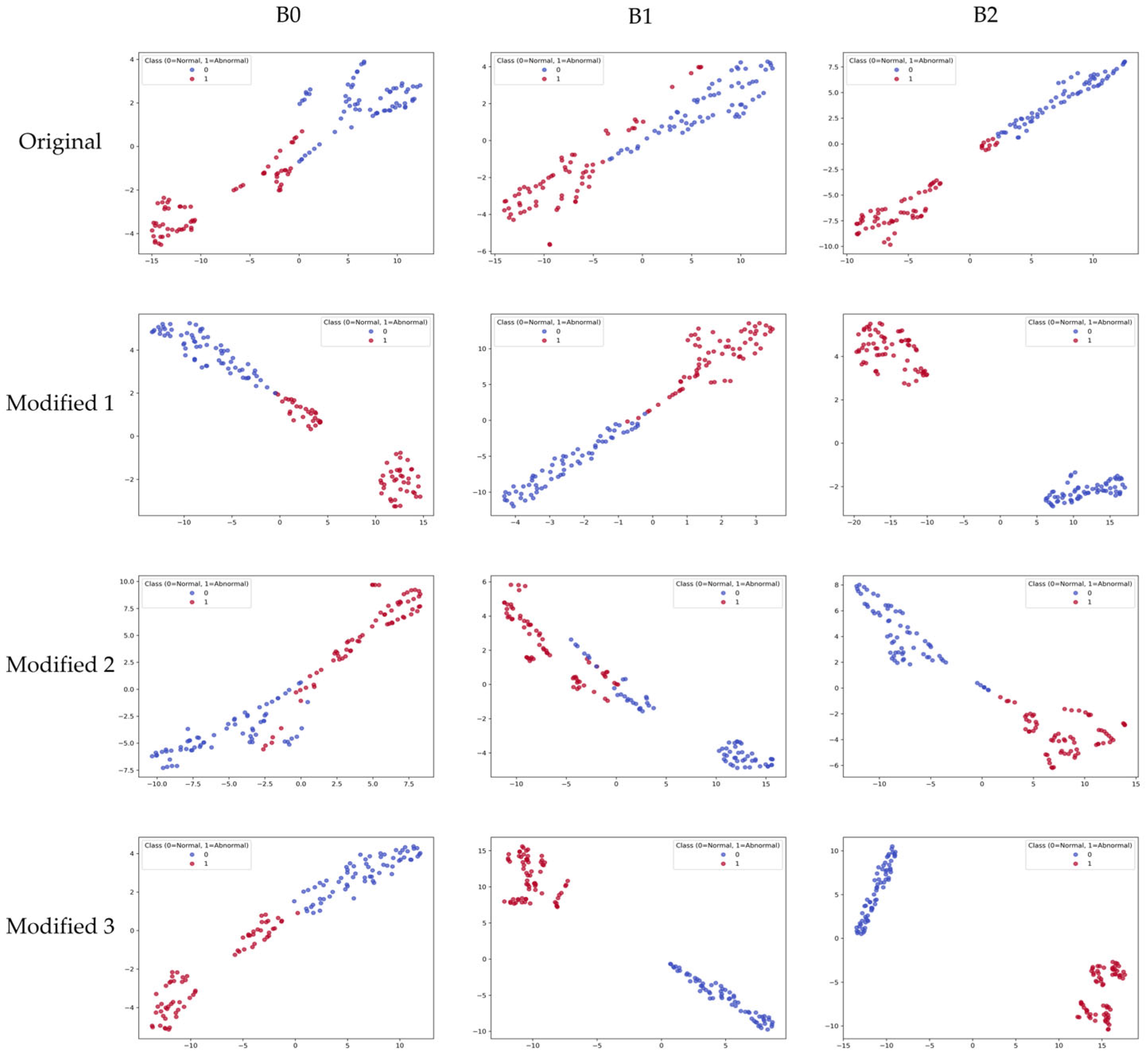 To visually analyze the feature representation distribution of the model, the results of projecting learned embeddings into 2D space using t-distributed Stochastic Neighbor Embedding (t-SNE) are shown in Figure 9. The t-SNE visualization was computed using the feature embeddings extracted from the layer immediately before the final FC layer, using all samples in the test set. In the original models, some overlap between normal and abnormal classes was observed, and class boundaries were not clear. In the proposed Modified models, Modified 1 and Modified 2 still showed partial overlap between normal and abnormal classes. Nevertheless, they appeared more clearly separated compared to the original models. In contrast, the Modified 3 model appeared in clearly separated cluster forms, showing the most distinct separation among all variants. These results mean that the proposed lightweighting strategy contributed not only to improving computational efficiency but also to improving discriminative power in the feature space.