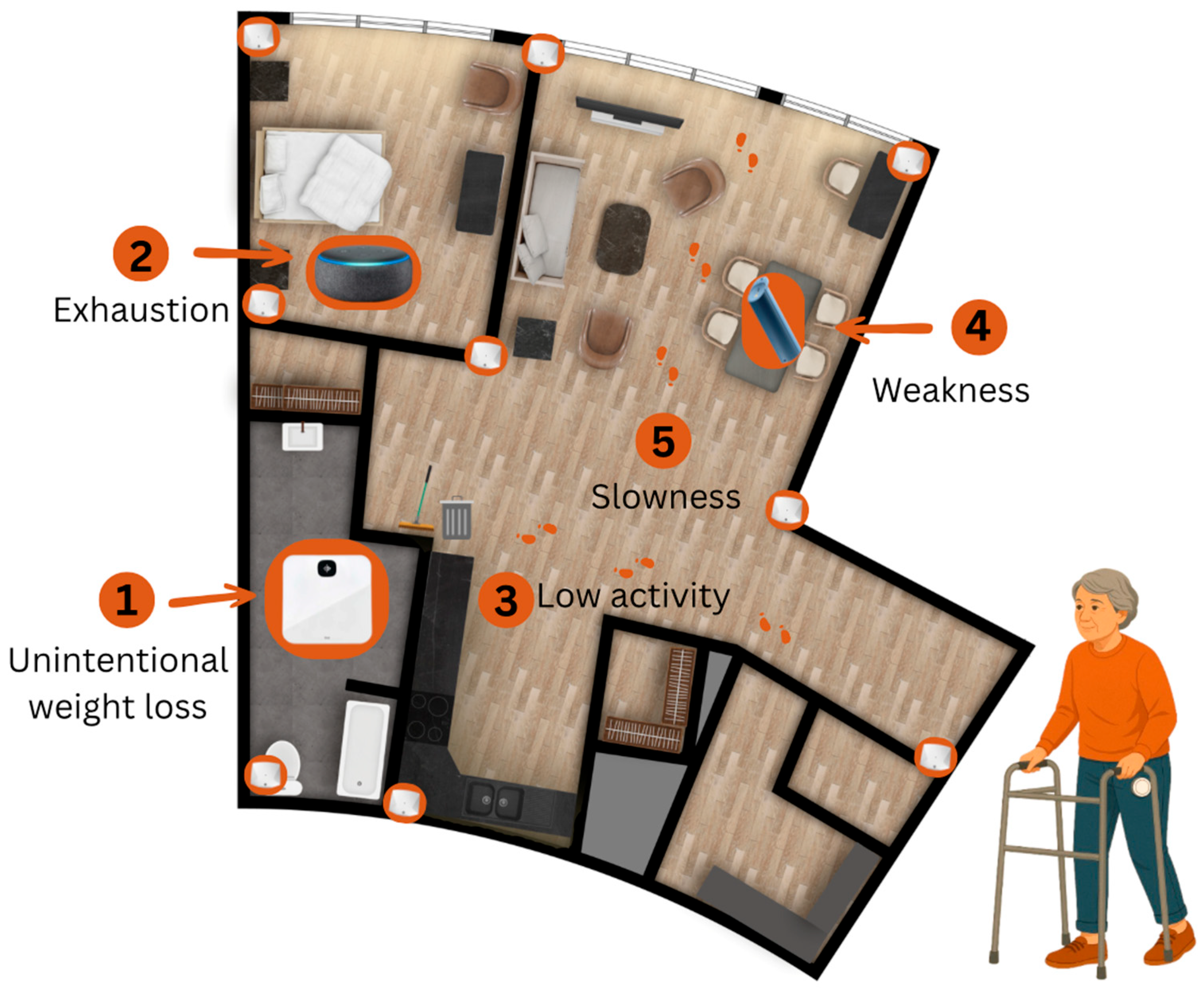 - Huang, J.; Zhou, S.; Xie, Q.; Yu, J.; Zhao, Y.; Feng, H. Digital Biomarkers for Real-Life, Home-Based Monitoring of Frailty: A Systematic Review and Meta-Analysis. Age Ageing 2025, 54, afaf108. [Google Scholar] [CrossRef]