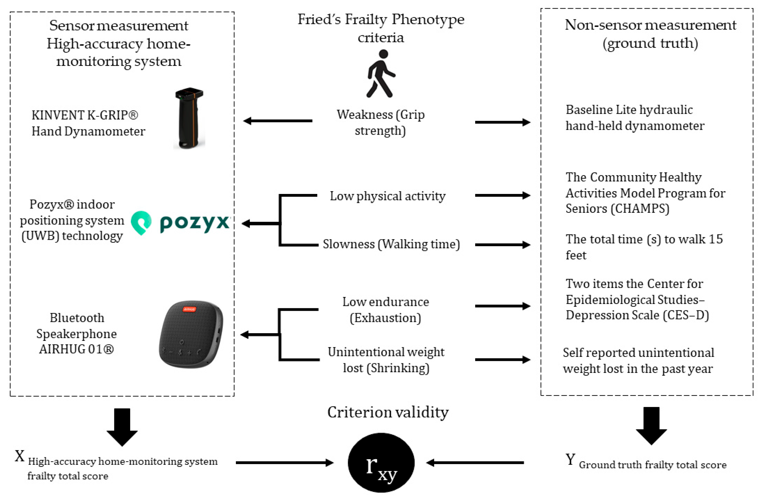 - Bian, C.; Ye, B.; Mihailidis, A. The Development and Concurrent Validity of a Multi-Sensor-Based Frailty Toolkit for In-Home Frailty Assessment. Sensors 2022, 22, 3532. [Google Scholar] [CrossRef]