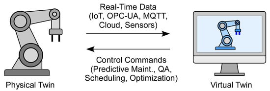 A crucial component of cell-level DT implementation is virtual commissioning, the process of simulating and validating automation control logic in a virtual environment before physical deployment, which accelerates the testing and validation of advanced control systems, especially in complex robotic manufacturing cells. DT simulations provide an efficient environment to test and fine-tune control systems prior to deployment in physical systems [71]. This approach significantly reduces implementation risks and debugging costs, facilitating rapid iteration and control logic refinement before deployment. By eliminating delays tied to hardware availability during the development phase, virtual commissioning significantly shortens the overall system deployment timeline [71].