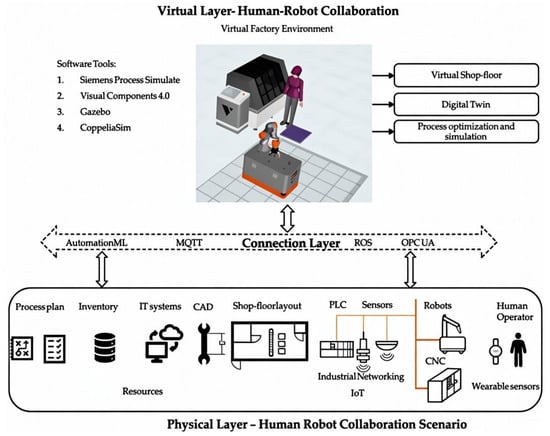 DTs play a critical role in enhancing safety and efficiency within automated manufacturing cells by enabling detailed simulation of human–robot interactions and supporting comprehensive scenario testing that improves the reliability of collaborative processes. They facilitate dynamic task delegation in human–robot collaborative assembly, continuously optimizing how each agent’s strengths are utilized [72]. In Human–Robot Collaboration (HRC) environments, where physical barriers are often impractical, the DT architecture shown in Figure 3 integrates AI-enabling technologies across layered physical, connection, and virtual components to address safety and coordination challenges. The physical layer employs machine vision for real-time human detection and tracking, IoT sensors to monitor robot states such as velocity, torque, and position, and wearable sensors to capture operator movements. The connection layer uses automated machine learning pipelines to process this multisensor data, enabling predictive safety monitoring and adaptive decision-making through communication protocols including MQTT, ROS, and OPC UA. The virtual layer leverages simulation platforms such as Visual Components, Gazebo, and CoppeliaSim to train and validate AI models in a risk-free environment prior to deployment. Collectively, this layered DT framework supports intelligent functions such as real-time collision prediction, dynamic task reallocation, and adaptive safety-zone adjustment [73].