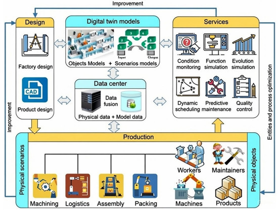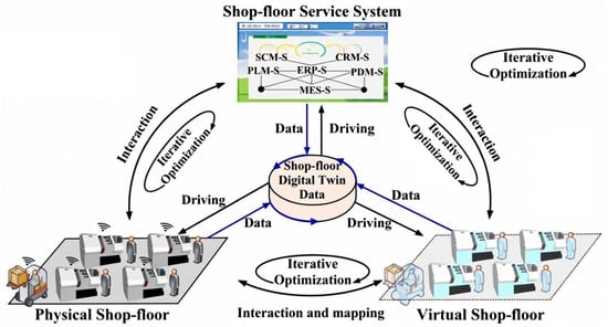 At the shop floor scale, DTs form system-of-systems architectures, integrating machines, cells, and human operators into a cohesive cyber–physical production environment. The paradigm of the DT shop floor (DTSF), proposed by Tao et al. [7], envisions total cyber–physical integration of a manufacturing line using DTs. This system-of-systems-level application advances the Industry 4.0 objective of decentralization through localized and in some cases automated decision-making. DT services at this level include continuous process optimization [22], optimization of shop floor layout [78], and virtual process planning and commissioning [79].