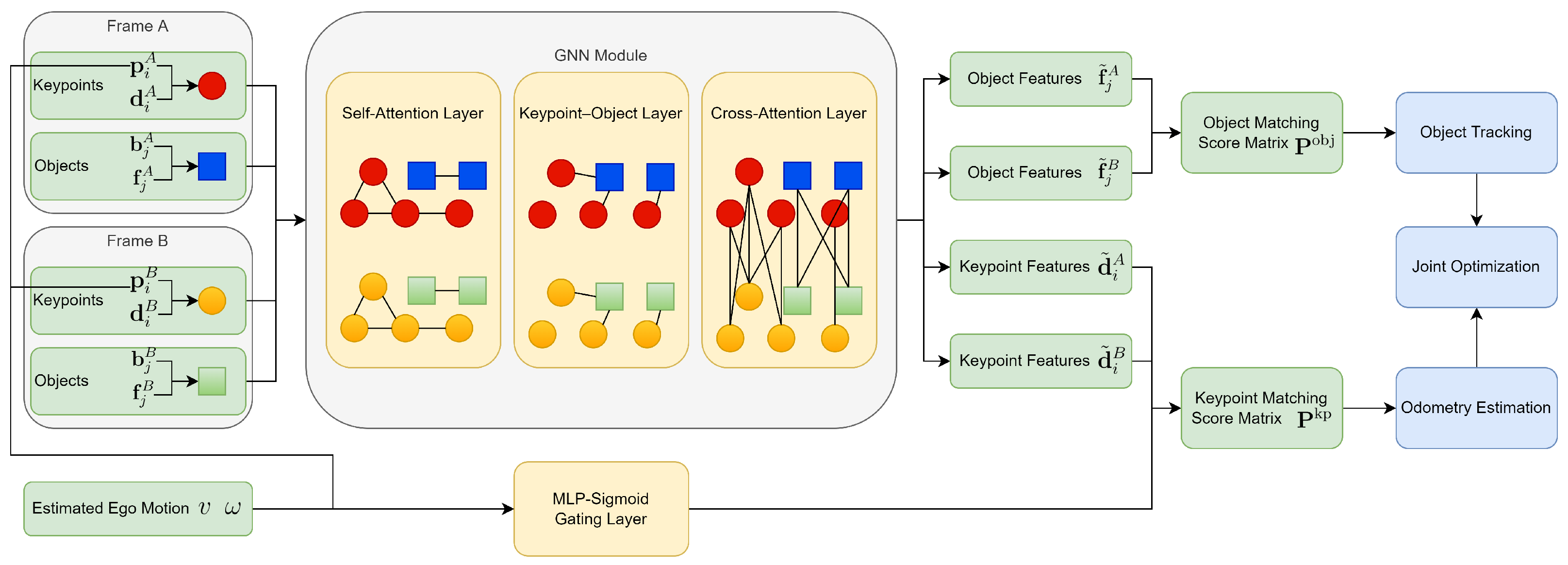 - We propose KOM-SLAM, a GNN-based, tightly coupled SLAM and multi-object tracking framework, where the GNN jointly learns associations between keypoints and objects. A soft assignment mechanism is applied to backpropagate the pose estimation loss through the GNN. To the best of our knowledge, this is the first learning-based system that tightly integrates SLAM and multi-object tracking.