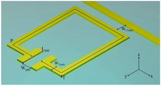 Figure 2 shows a schematic diagram of all resonator geometries investigated in this work, which were chosen owing to their commonality in the literature, both for the THz and microwave frequency ranges [27,28,29]. While other geometries are found in the literature, this work provides a general methodology for comparison, and the 6 chosen aim to show that despite the differences in overall structure, rather than differences in certain parameters, the methodology allows fair comparison. The geometries are as follows and shown in Figure 2: (a) split-ring resonators (SRRs); (b) rotated split-ring resonators (rSRRs), in which the capacitive gap is oriented at 90° relative to the SRRs in (a); (c) centre-split-ring resonators (CSRRs); (d) rotated centre-split-ring resonators (rCSRRs), where the capacitive gap is oriented at 90° relative to the CSRRs in (c); (e) double-split-ring resonators (DSRRs); and (f) the QWS resonator. As also shown in Figure 2, we can further categorise each SRR by its aspect ratio AR = w:h, where width is defined parallel to the transmission line, for variations AR = 2:1, 1:1, and 1:2. Exploration of these variations provides a better understanding of how the capacitive gap orientation and inductive perimeter affect resonator performance and field distribution. The QWS resonator was included as a benchmark design commonly found in the literature. It has a much smaller design-parameter space that can be readily optimised for a specific frequency, and its inclusion therefore also allows for comparison between LC resonances and its standing-wave resonance. The dimensions of the QWS are given by its length (93.2 μm), width (5 μm), and thickness (110 nm), chosen to also achieve an unloaded resonance at 500 GHz. For all split-ring resonators studied, certain dimensions (seen in Figure 3) were fixed for comparison, including the resonator conductor width WTrack = 2 μm, metal thickness T = 110 nm, capacitive arm length Lgap = 20 μm, capacitive gap width Wgap = 6 μm, and coupling gap width WCouple = 1.5 μm. The PGL transmission line (also pictured in Figure 3) extended the full length of the simulation domain, and had a width of 5 μm and the same metal thickness T as the resonators. The inductive perimeter P is given by P = aP0, where P0 is the initial inductive perimeter (P0 = 100 μm), while a is a scaling factor used (). The WCouple parameter specifically is one which could affect resonator performance. It was chosen to be 1.5 μm, since this is both a small enough gap to ensure reasonably high coupling efficiency, and a large enough coupling gap size to ensure that these resonators are manufacturable under standard lithographic conditions. We note that trends observed when comparing resonator geometries should remain consistent for any WCouple value, so long as this value is maintained between different resonator geometries.
