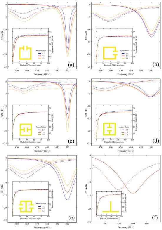 The forward transmission parameter S21 for each resonator is presented in Figure 5, which includes S21 for each unloaded resonator (solid lines) and for a 100 μm thick overlaid layer of S1813 (dashed lines). For each case, the loaded resonance frequency is down-shifted by 40–50 GHz from resonance upon loading with S1813. Insets in Figure 5 show the corresponding evolution of this frequency shift as the dielectric thickness is increased from 0 μm to 100 μm for each different aspect ratio. In each case, the frequency shift is observed to change rapidly for thin layers of the dielectric, before saturating as dielectric thickness increases. Plots are labelled (a)–(f) in accordance with the Figure 2 labels. The data from Figure 5 were used to calculate the FOMs Q-factor, sensitivity, responsivity, and sensing volume for each resonator geometry, which are summarised in Table 1.