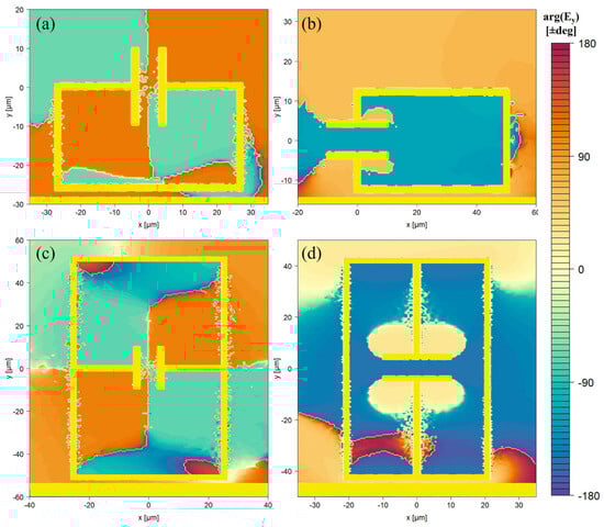 Each of the LC-resonance structures exhibits an unloaded Q-factor ranging between 18 and 130, with the highest Q-factor occurring in the 1:2 variant of the SRR and CSRR, whilst the lowest occurs in the 1:2 variant of the rCSRR. Upon loading with 100 μm of S1813, the Q-factor of all resonators is observed to decrease, as expected for interaction with a lossy dielectric. This can be observed in the reduction in absorption magnitude and the broadening of the resonances seen in Figure 5a. Greater relative reduction in Q-factor was found for the structures that have a higher unloaded Q-factor, as seen in the ΔQ-factor column. In comparison to the LC-resonance structures, the QWS produced a lower unloaded Q-factor of 5.5, though we note that its ΔQ-factor is low compared to the split-ring designs; i.e., the Q-factor of the stub appears to be less affected by interaction with the lossy dielectric. A clear trend can be observed whereby LC resonators with the capacitive gap oriented parallel to the transmission line (SRR and CSRR) produce a higher Q-factor compared to the designs which have the capacitive gap oriented perpendicular to the transmission line (rSRR, DSRR, rCSRR). In addition, designs in which the capacitive gap is located parallel to the PGL (1:2 aspect ratio) produce higher Q-factors for almost all structures. The variation in response observed upon rotation is related to the polarisation of the E-field between the transmission line and the resonator. Figure 6 maps the phase of the electric field component aligned with the transmission line, , at resonance.