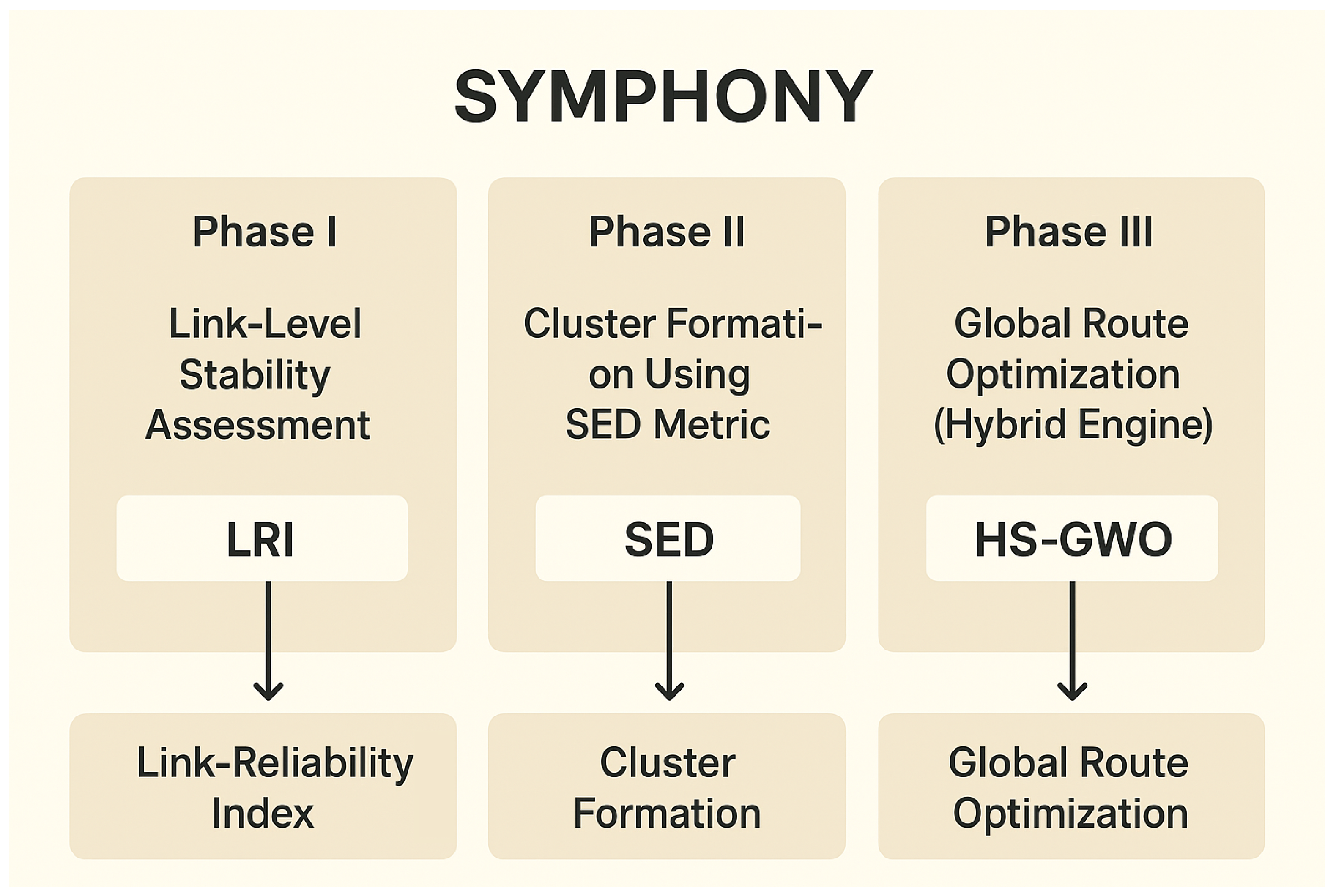 This paper has proposed a routing architecture that will enhance reliability, energy efficiency and environmental sustainability in VANETs. The protocol integrates link level evaluation, cluster optimization and global route choice by a hybridized Harmony Search-Grey Wolf optimization model. In contrast to the previous schemes that aim at achieving only one goal, SYMPHONY adapts dynamically to the changing traffic and energy conditions at the moment. Comprehensive simulations proved that it achieved apparent performance improvements compared to MEDALS, CARAC, and OptiFlow. Enhanced delivery of packets, latency, control overhead and energy operation were among the improvements. The inculcation of Green Performance Index (GPI) also made SYMPHONY a sustainability-focused protocol.