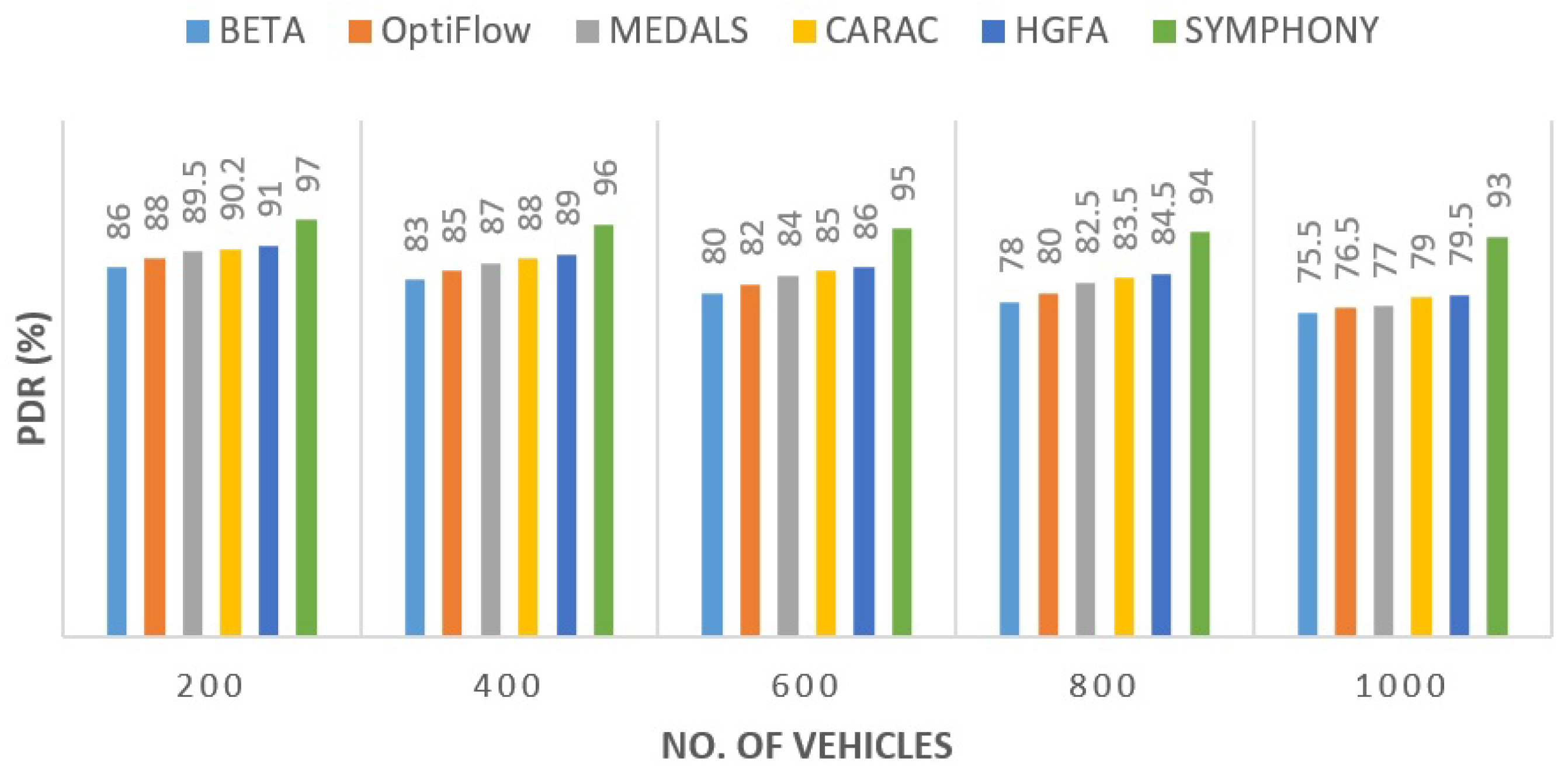 To evaluate robustness under mobility variation, vehicle speed was varied from 30–90 km/h. While all protocols exhibited mild degradation at higher speeds, SYMPHONY maintained a consistent performance lead: PDR decreased by only 3.8% at 90 km/h, compared with 7–12% drops in competing protocols.