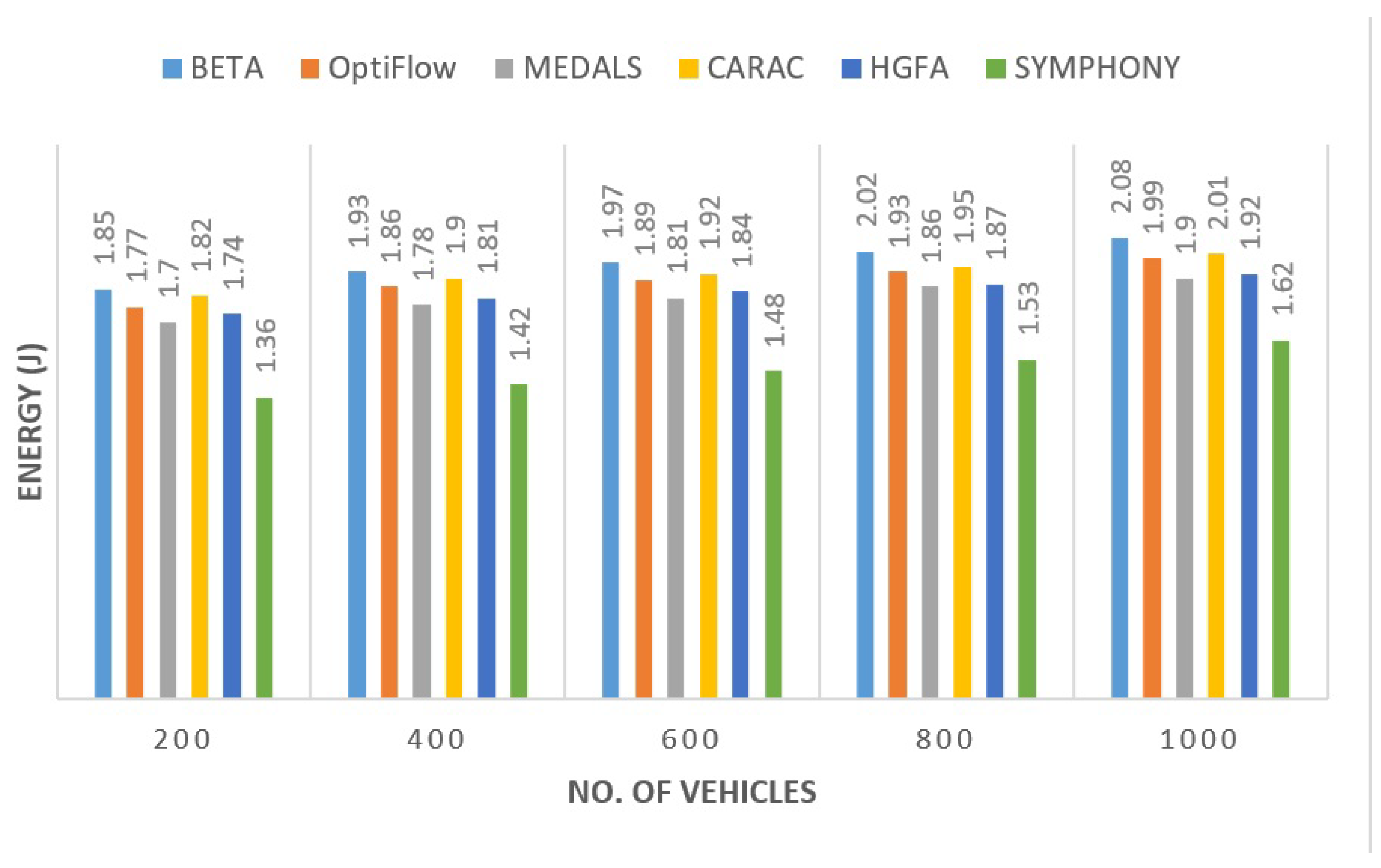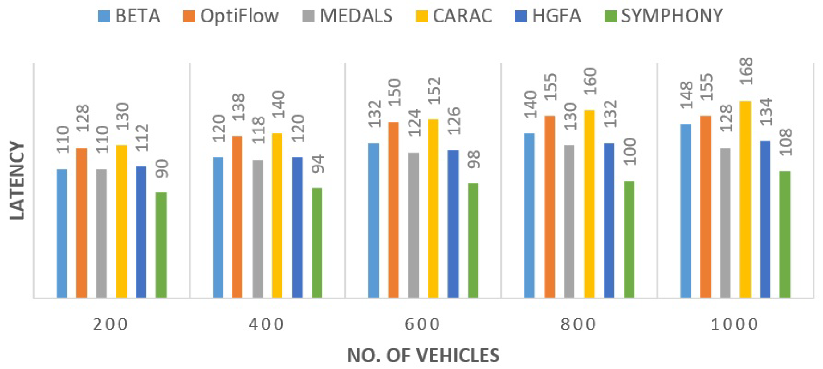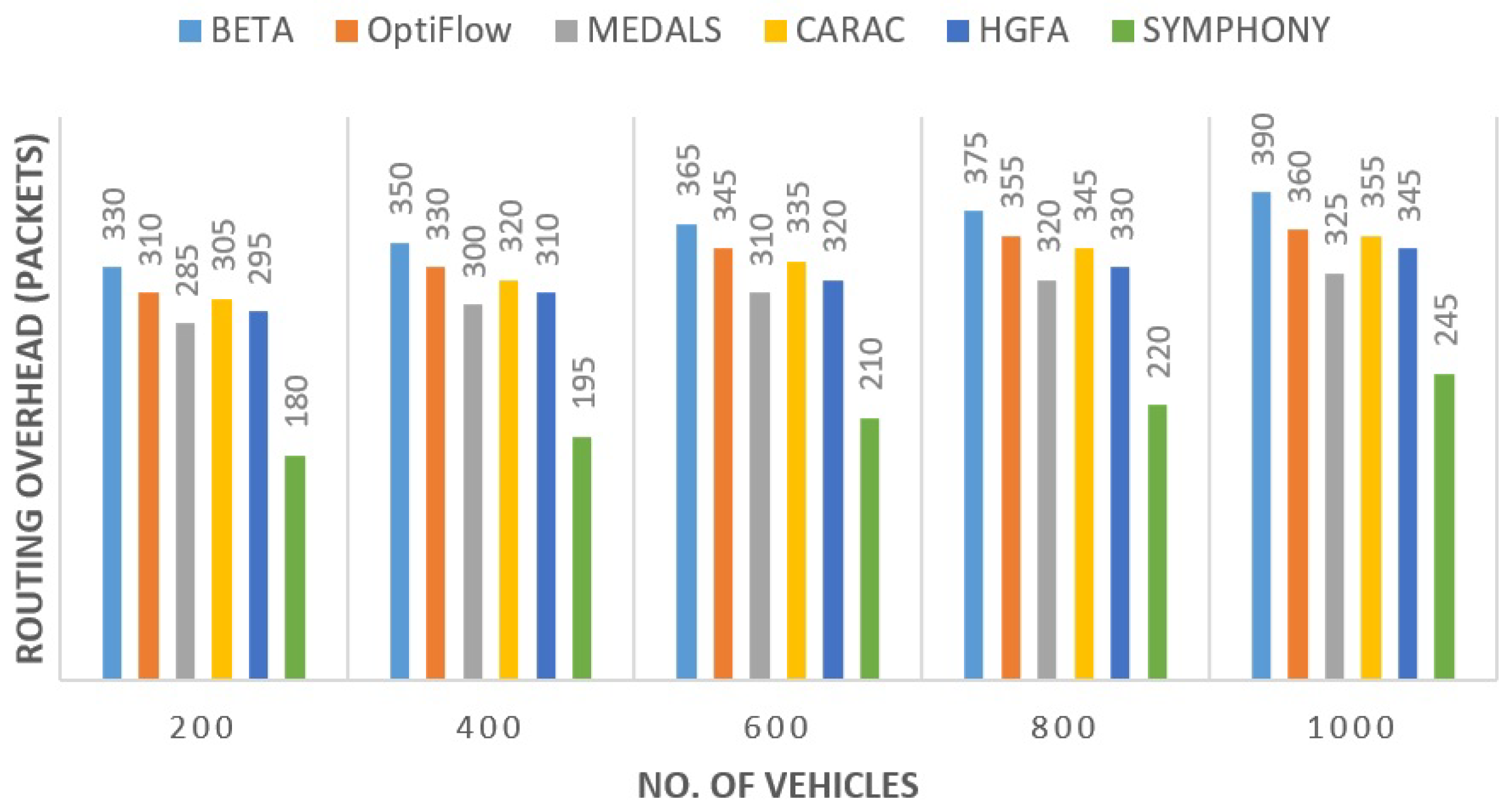 Figure 4, SYMPHONY had the lowest transmission time of all the routing candidates. The unnecessary hop traversal and congestion buildup were averted by its hybrid HS–GWO optimization. The latency was reduced by approximately 21.6% relative to HGFA and approximately 24.6% relative with BETA. These improvements are because of smoother handovers and coordination at cluster levels which reduce the re-routing of packets with rapid mobility.