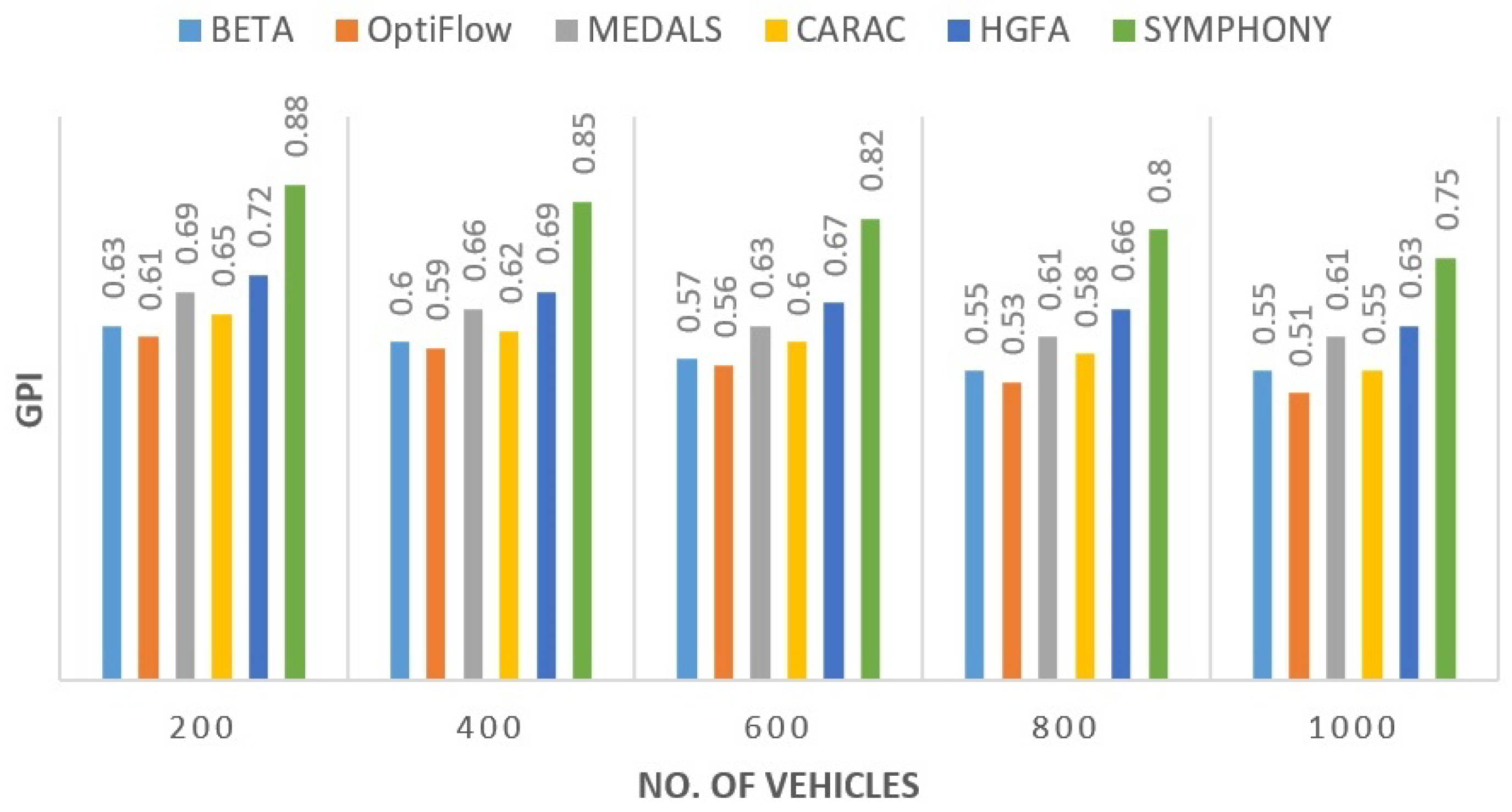 Figure 8 presents a sustainability comparison, which is based upon GPI. The design of the proposed protocol provided an average 28% improvement to that of MEDALS and 46% over OptiFlow. The carbon savings were in its cluster level energy sharing and stability control. As far as the environment is concerned, this result justifies the eco-metric assessment in the future vehicular routing studies.