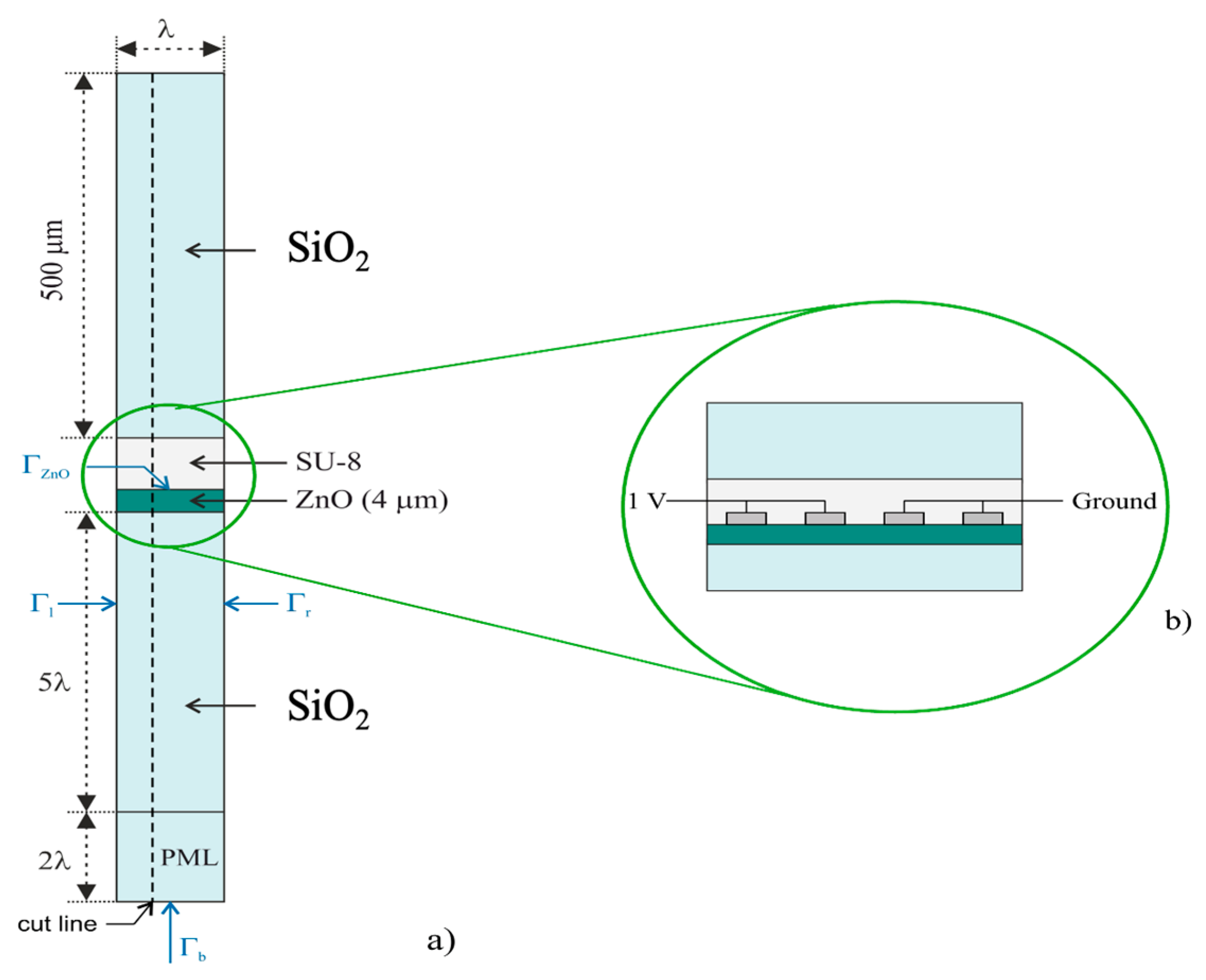 Figure 1a. For frequency domain studies, IDTs in spit finger configuration consisting in four Al electrodes (0.15 µm thick and λ/8 wide) were considered for the surface of the ZnO layer. Electrodes were connected to 1 V or grounded as shown in the detailed view reported in