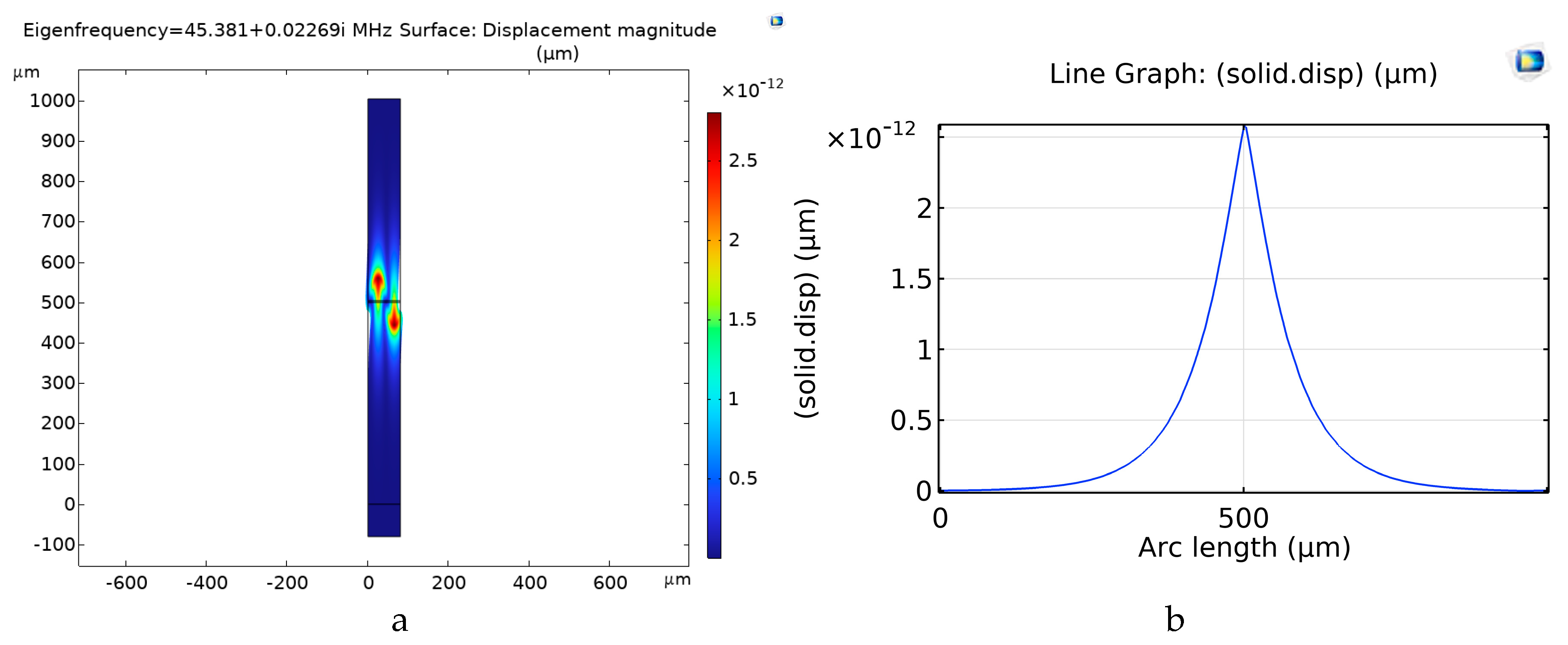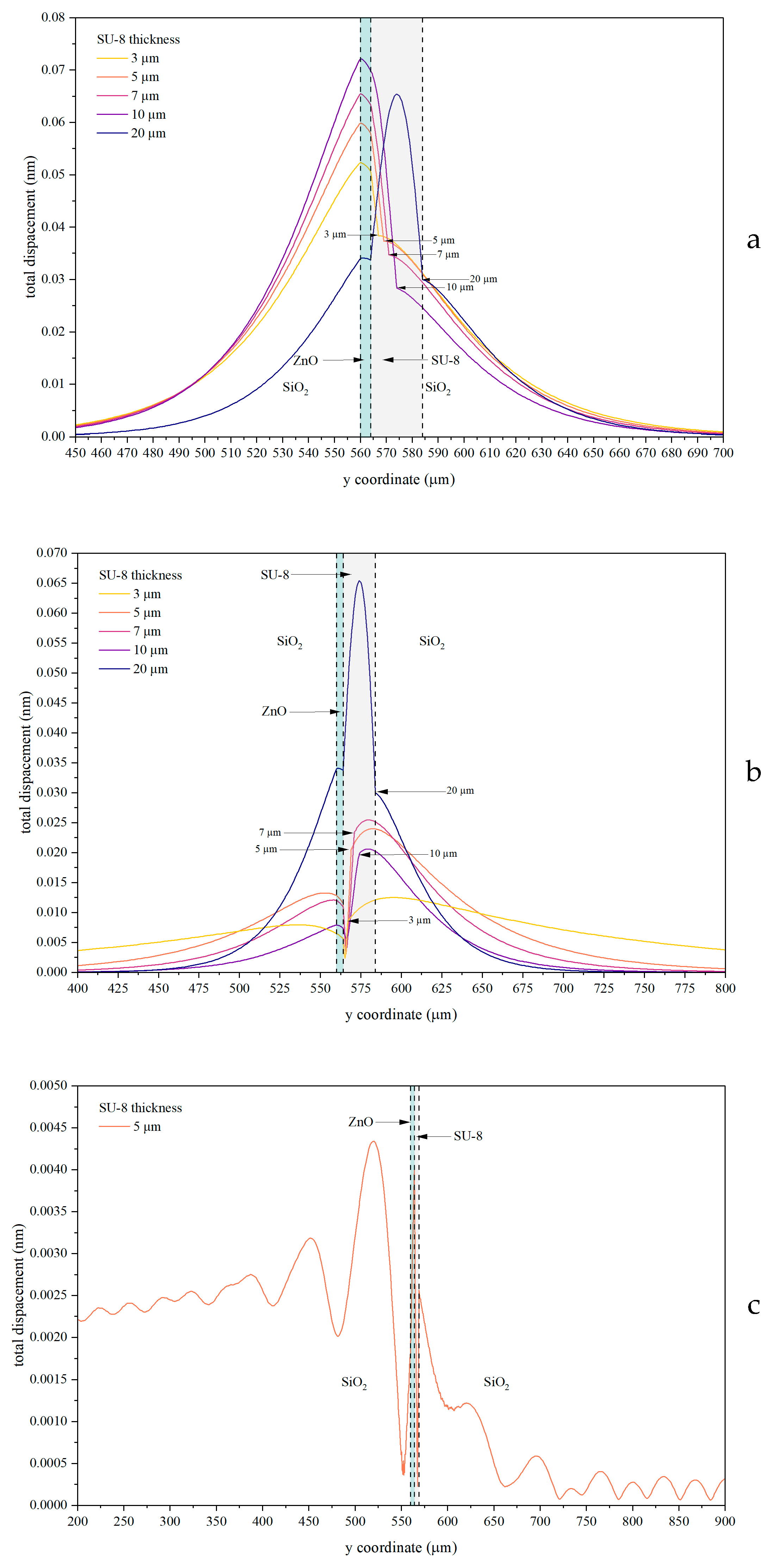 Figure 7c shows the displacement profile of the LIAW for an SU-8 thickness of 5 µm. The acoustic field exhibits a pronounced localization at the ZnO/SU-8 interface, while decaying away from it into both SiO